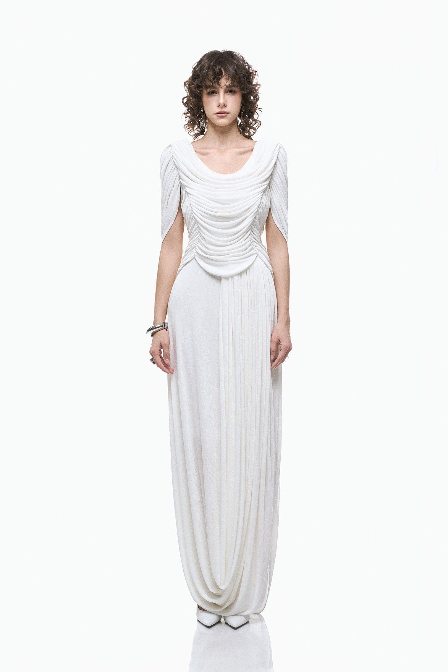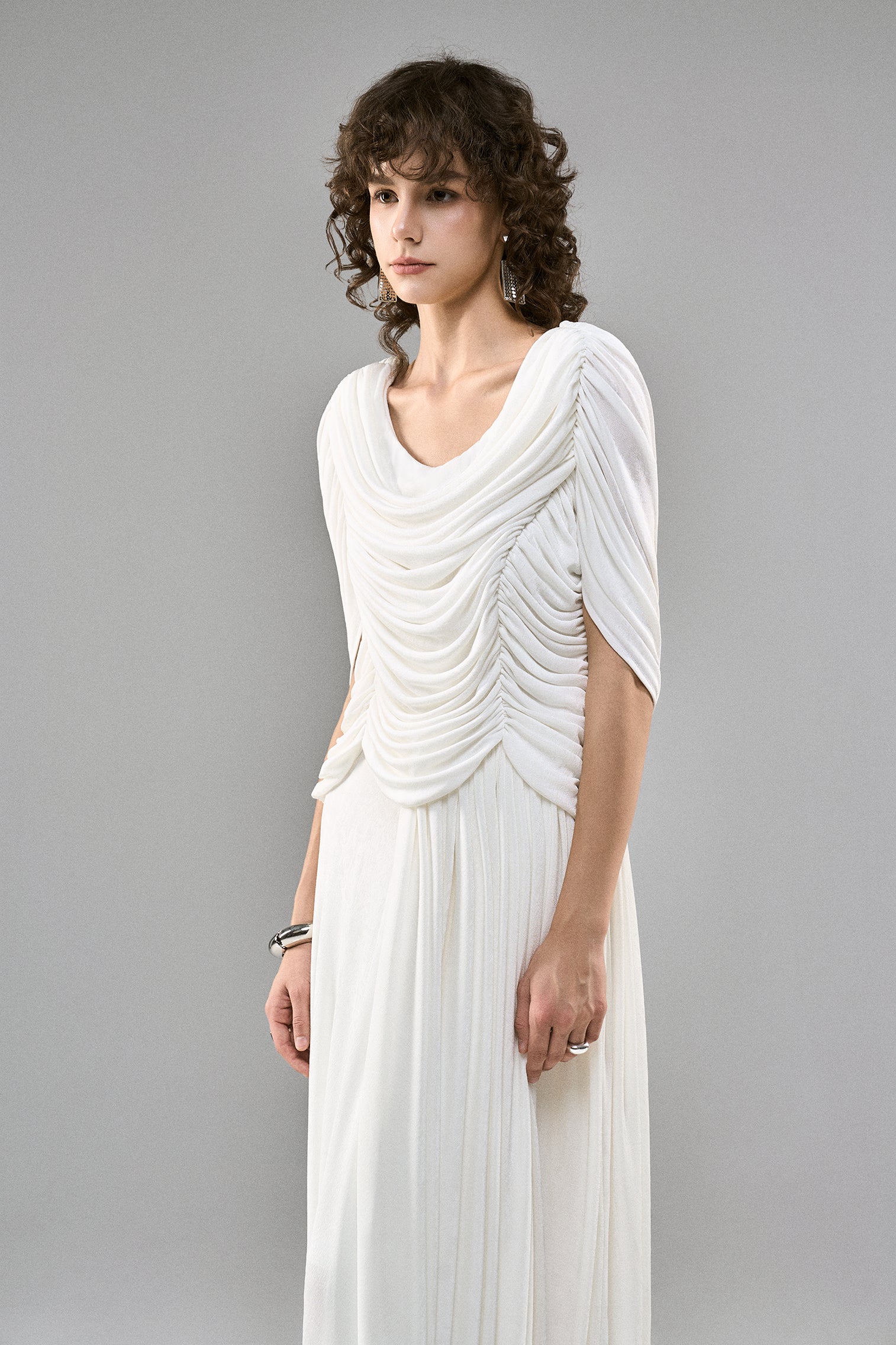 The Cascade Dress is crafted in soft jersey spandex with a fluid cowl neckline, gathered shoulders, and sculpted ruching through the bodice. An elongated skirt falls with gentle movement, forming a relaxed yet refined silhouette.