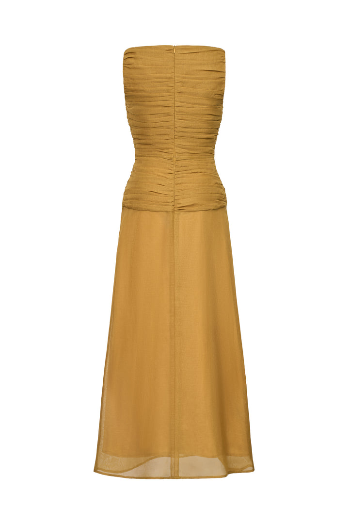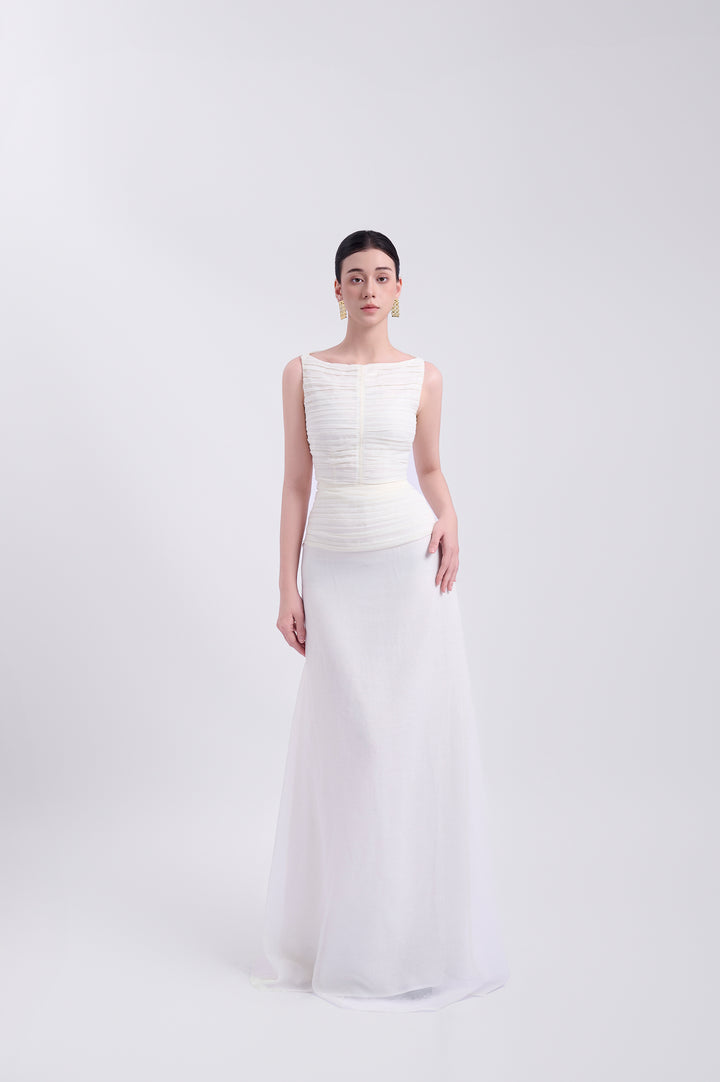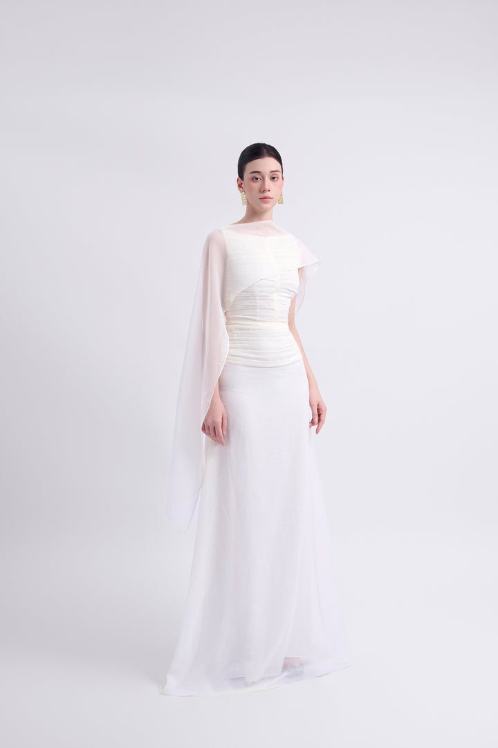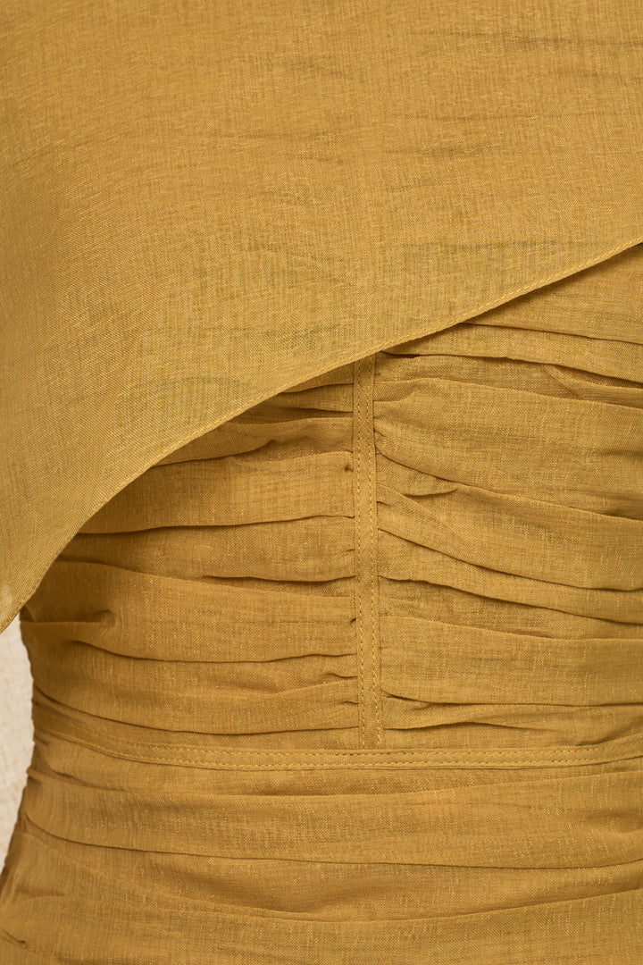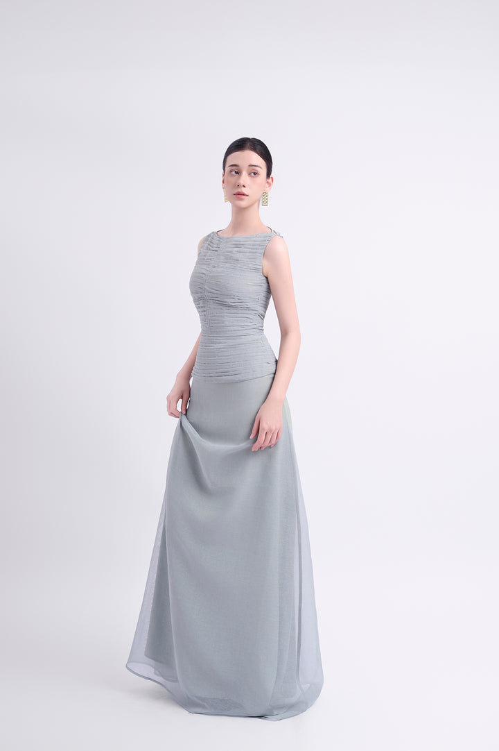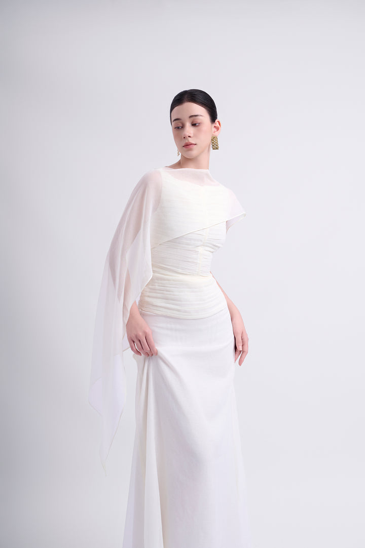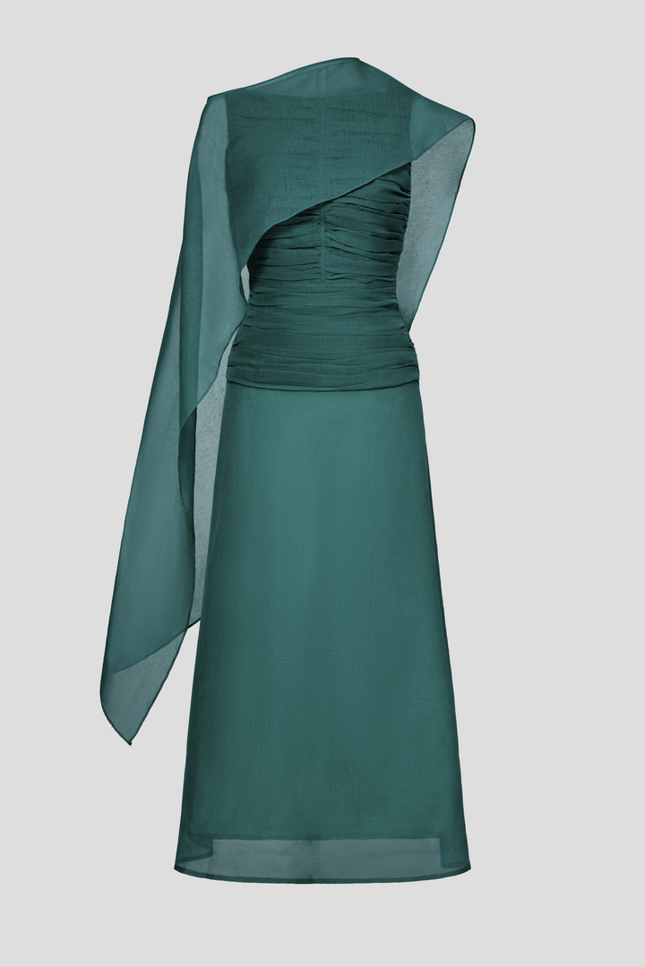 Fitted dress with an A-line flared skirt, featuring a halter neckline with natural pleating cascading from the neck to the waist. Sleeveless, with a back zipper. The dress offers two styling options: it can be worn with a detachable shoulder drape or as a sleek, sleeveless design.