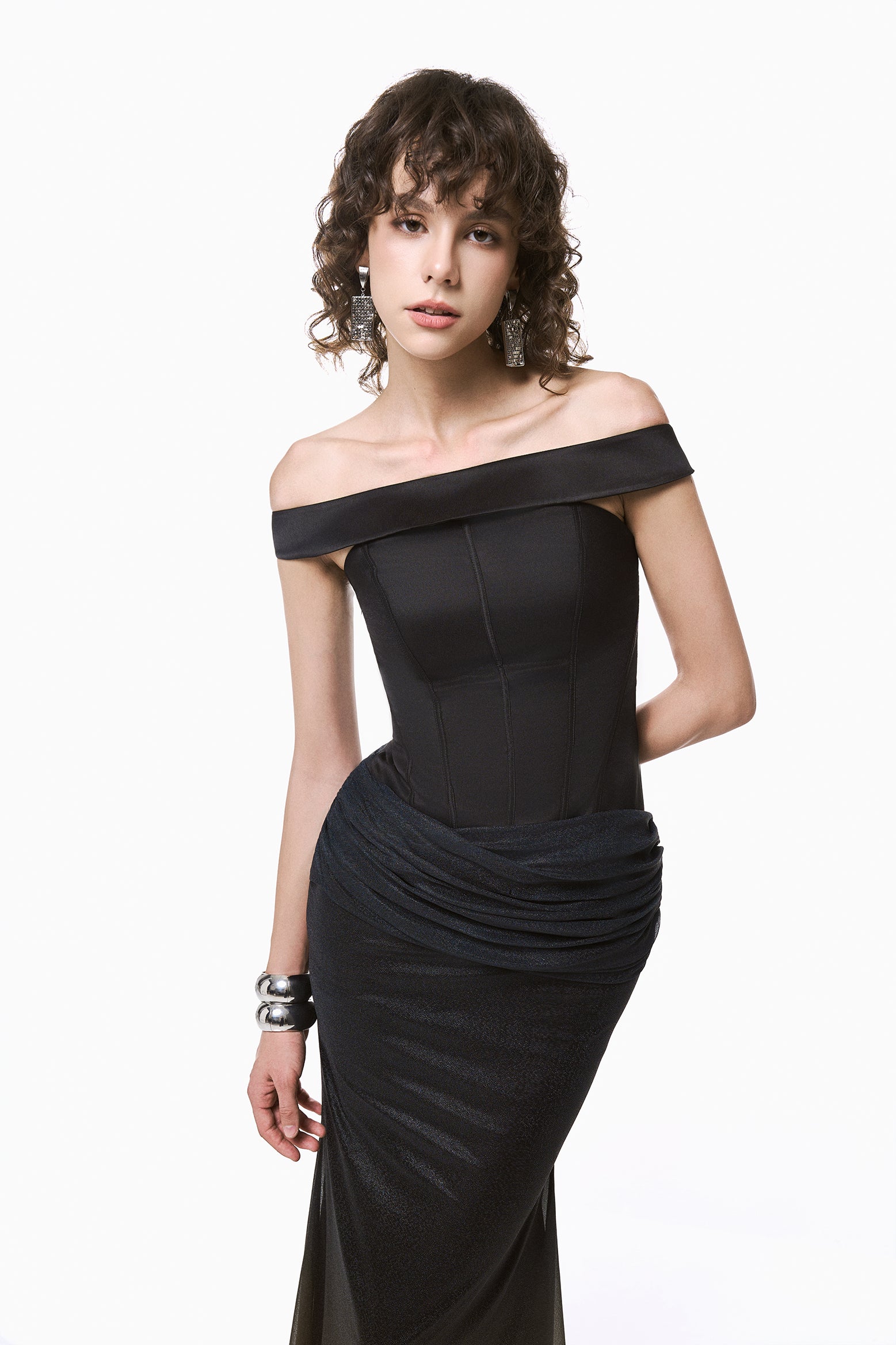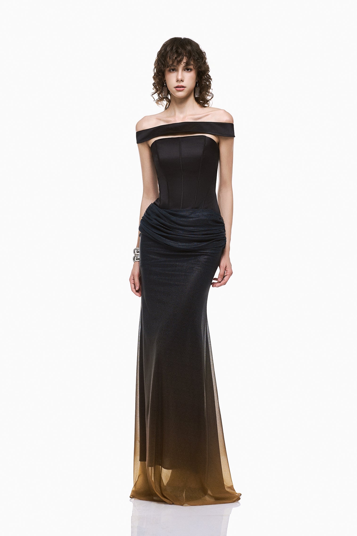 Elara is crafted in mango taffeta with a sculpted strapless bodice shaped by clean vertical seaming and a refined off shoulder band. A sheer chiffon overlay gathers through the hip to form directional draping while the skirt falls into a slim elongated column. Poise in motion.