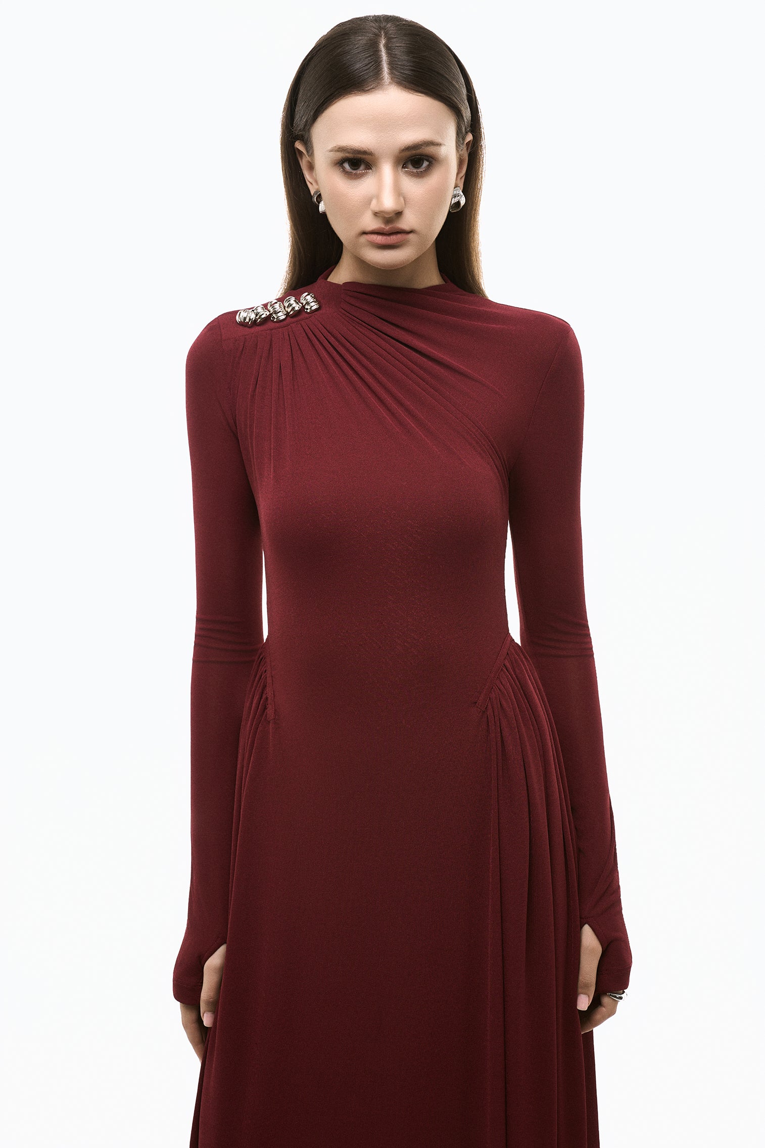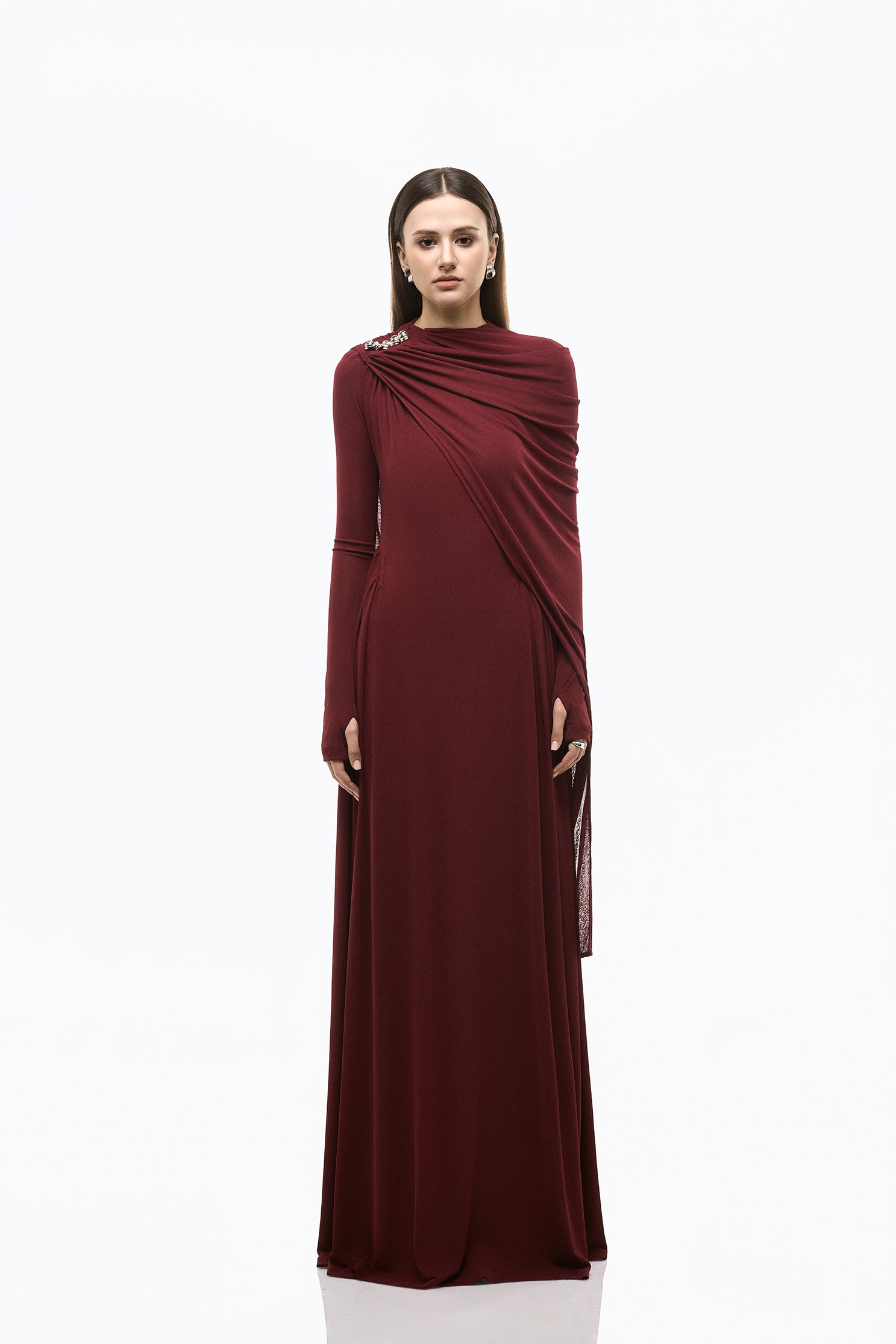 Elarise is cut from jersey spandex with a clean high neckline and elongated fitted sleeves that shape the upper body in a smooth continuous line. The skirt falls into soft vertical pleats that release from the waist and extend into a long fluid column. A silhouette that moves with ease.