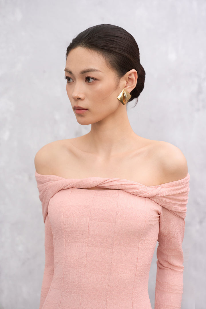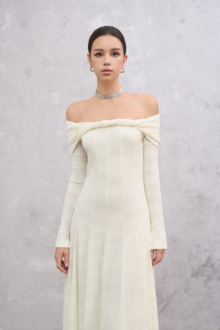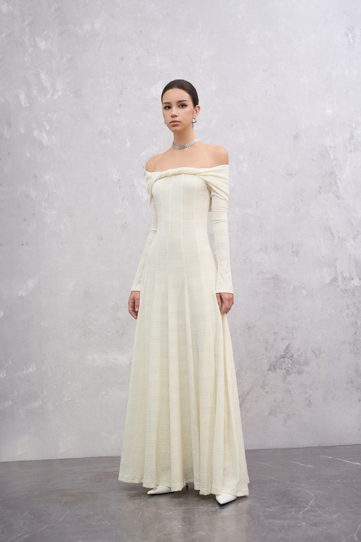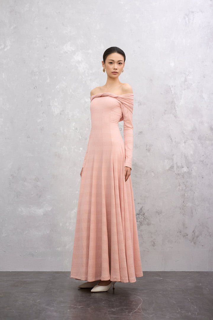 With a collar that unfurls like a petal in bloom, the Elowen Dress frames the shoulders in soft, sculptural grace. Its textured fabric catches light with quiet shimmer, while the skirt falls in a gentle flare—measured, fluid, and composed. Elowen is made not to dazzle, but to endure—rooted in elegance, and radiant in stillness.