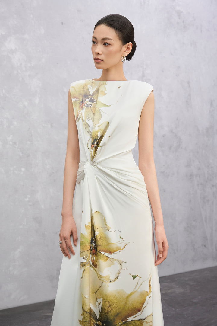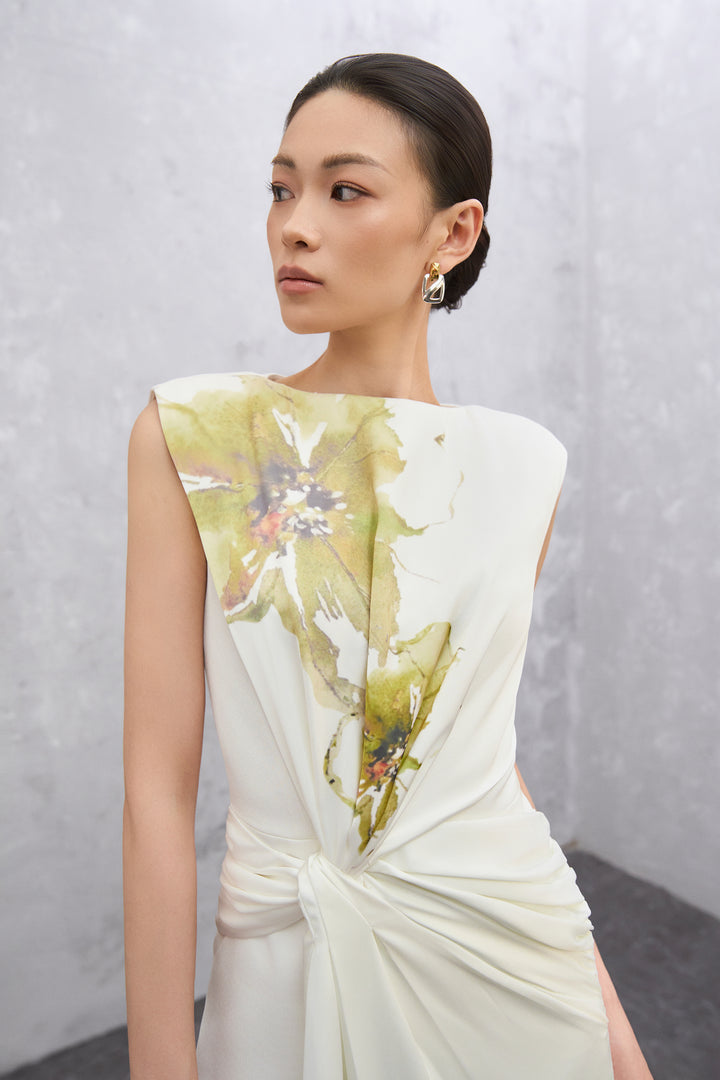 Like a flower in bloom, your allure unfolds with quiet grace. A fluid silhouette framed by sculpted shoulders and a softly gathered waist. Graceful folds ripple along a column of blooming print, with a knotted front detail that draws the eye. Designed to move with natural poise, the Florea Dress captures the quiet power of becoming — light, composed, and effortlessly elegant from morning to evening