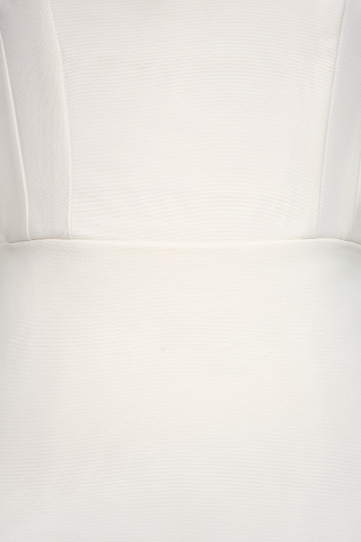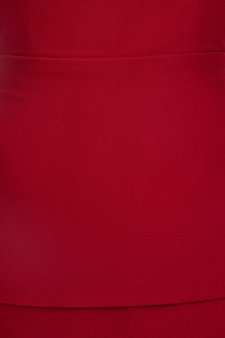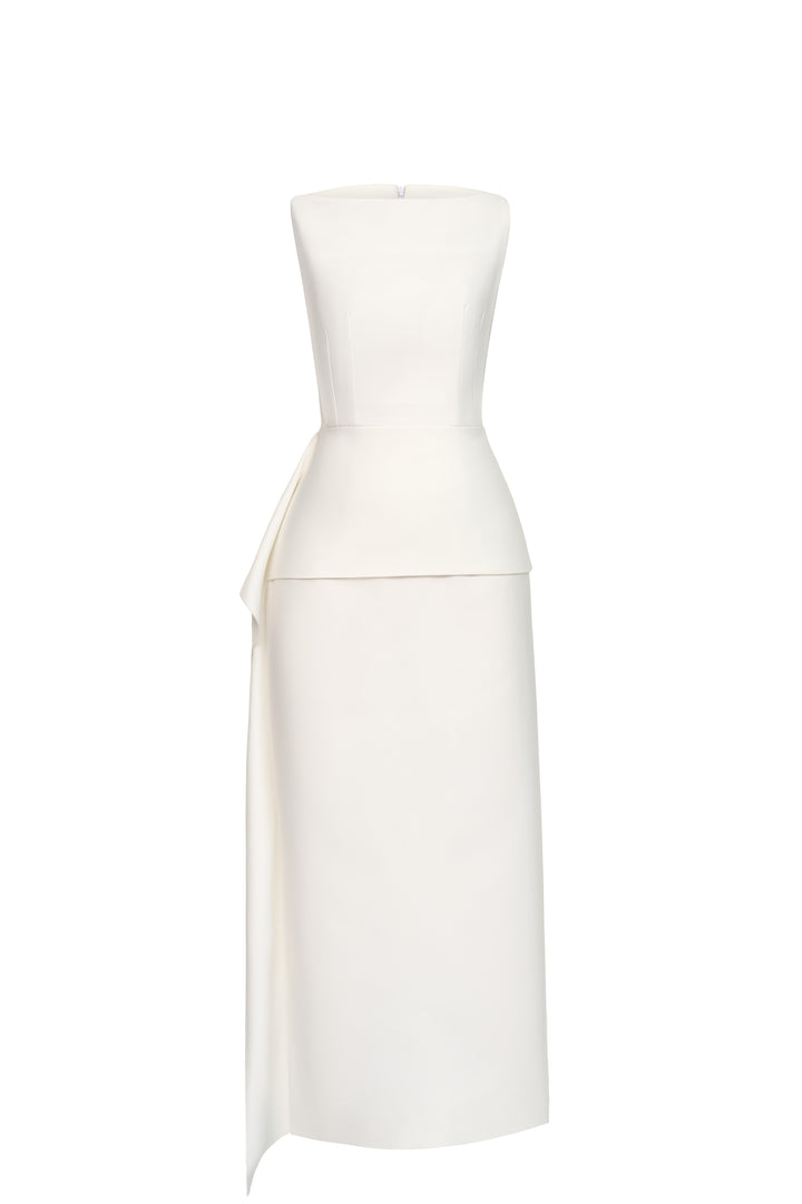 Halter-neck dress with a fitted waist and straight-cut skirt. Sleeveless, fully lined, and secured with a back zipper. A delicate overlay drapes around the waist, adding a flowing touch that subtly conceals the midsection.