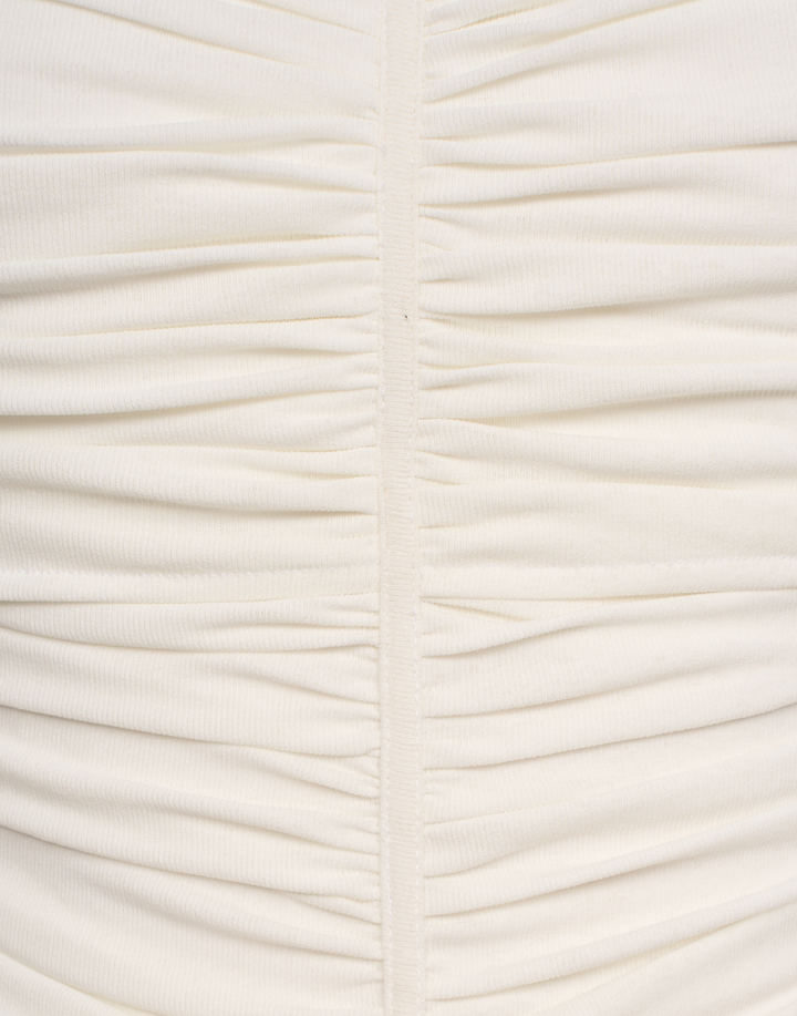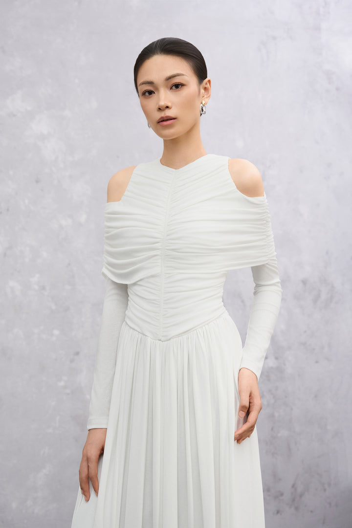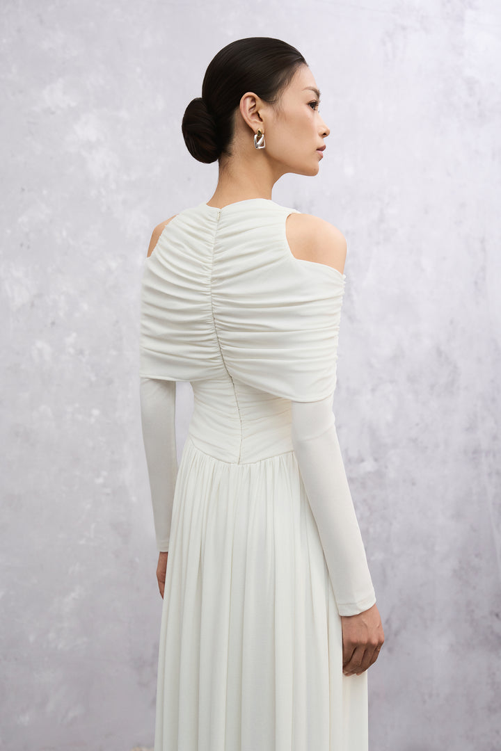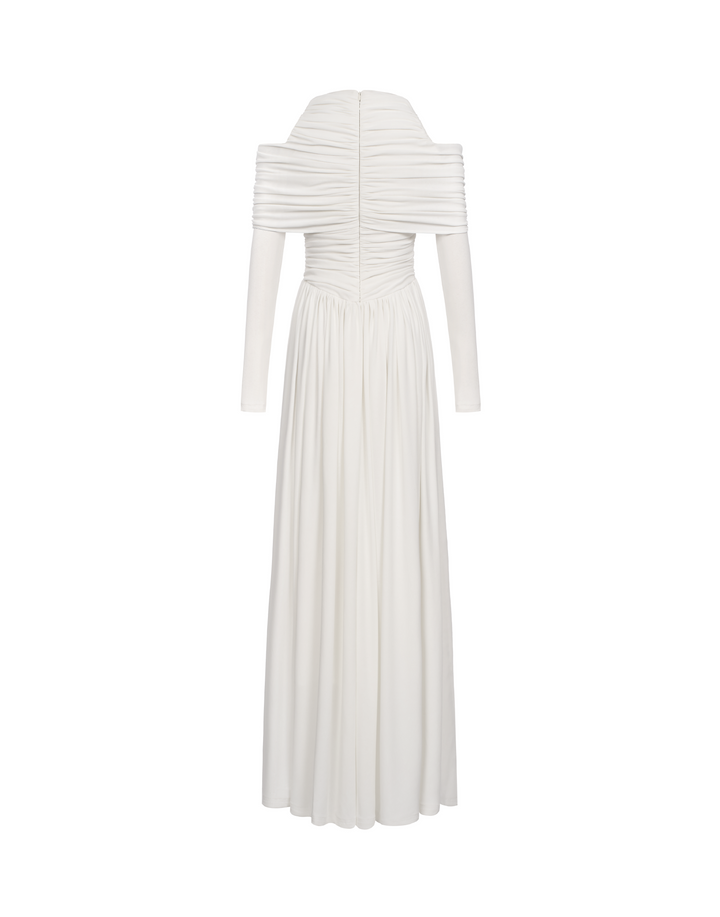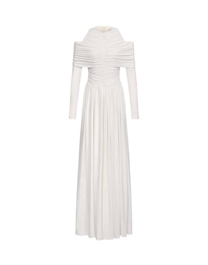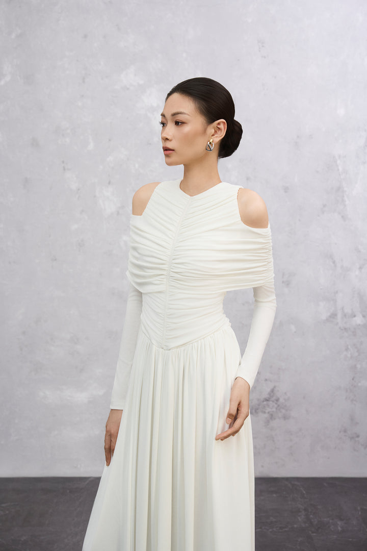 Like moonlight across still water, the Lunaria Dress moves with quiet grace. A ruched bodice gathers light into soft folds, unfolding into a flowing skirt that breathes with every step. She doesn’t shout — she glows.