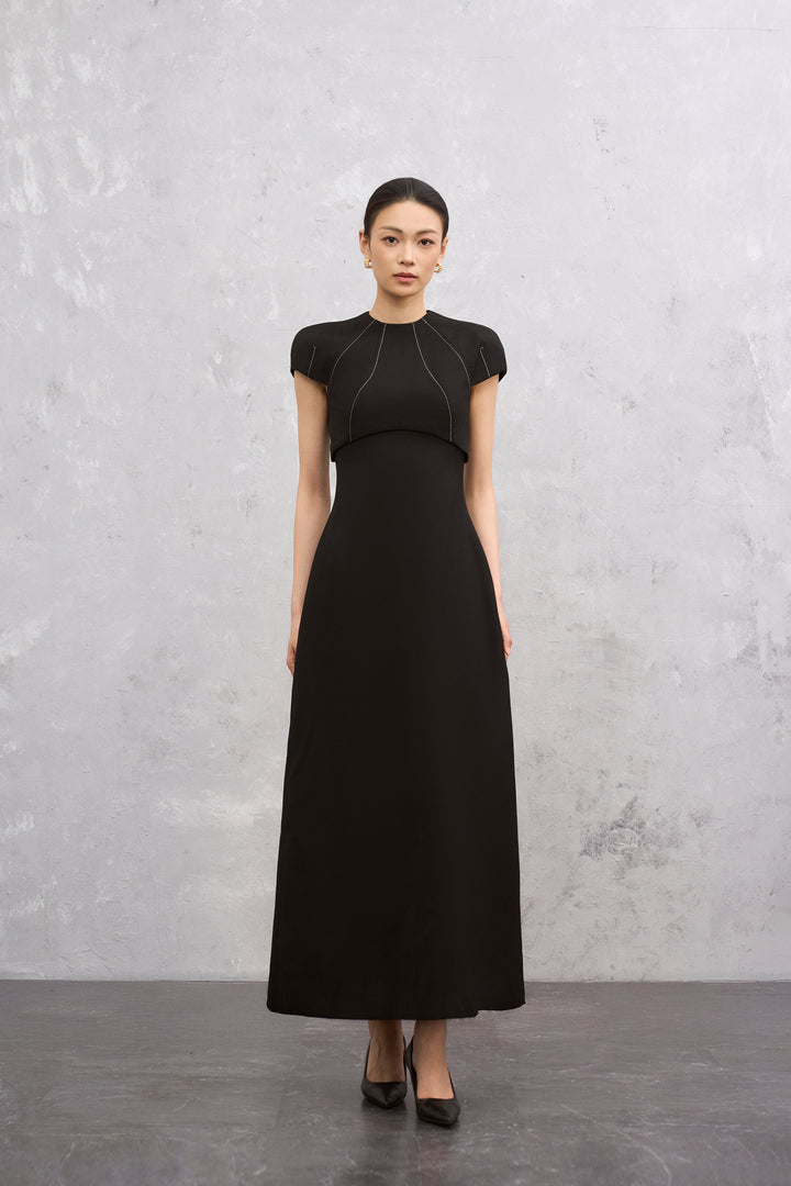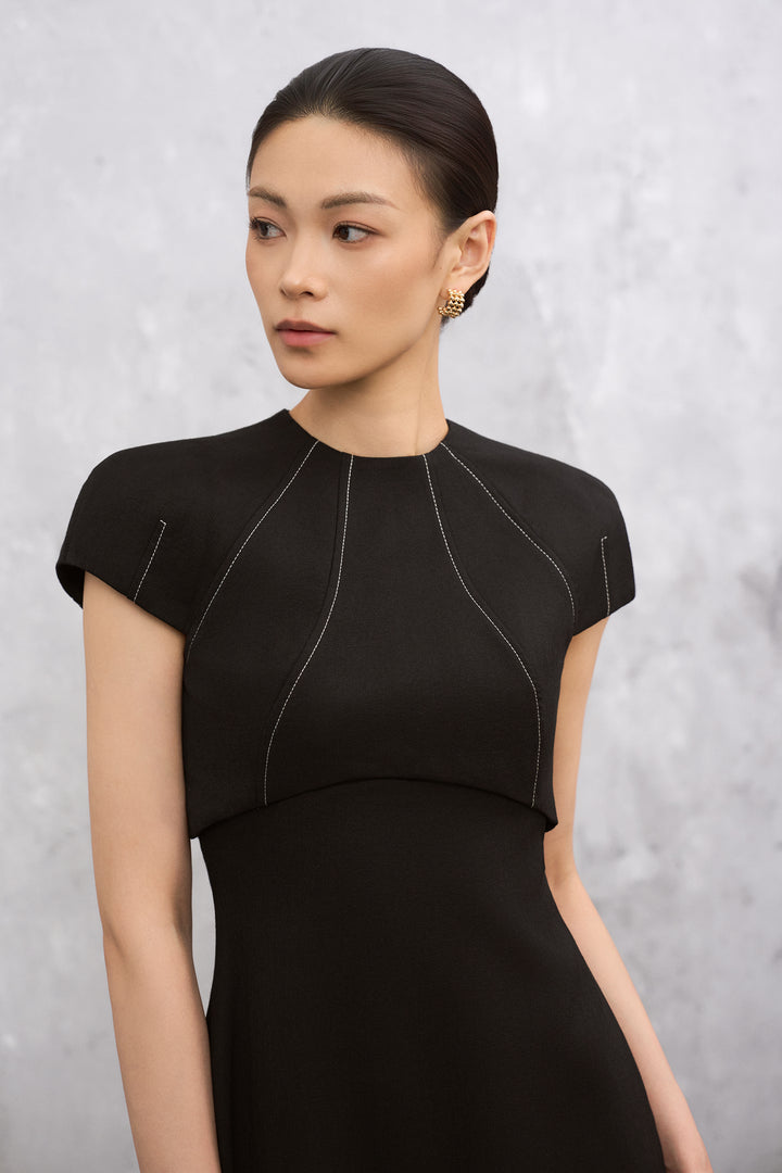 Inspired by the quiet geometry of starlight, the Lyra Dress brings structure and ease into perfect accord. Sculptural seam lines radiate from a clean neckline, framing the form with subtle precision. With every movement, it reveals a composed and effortless elegance.