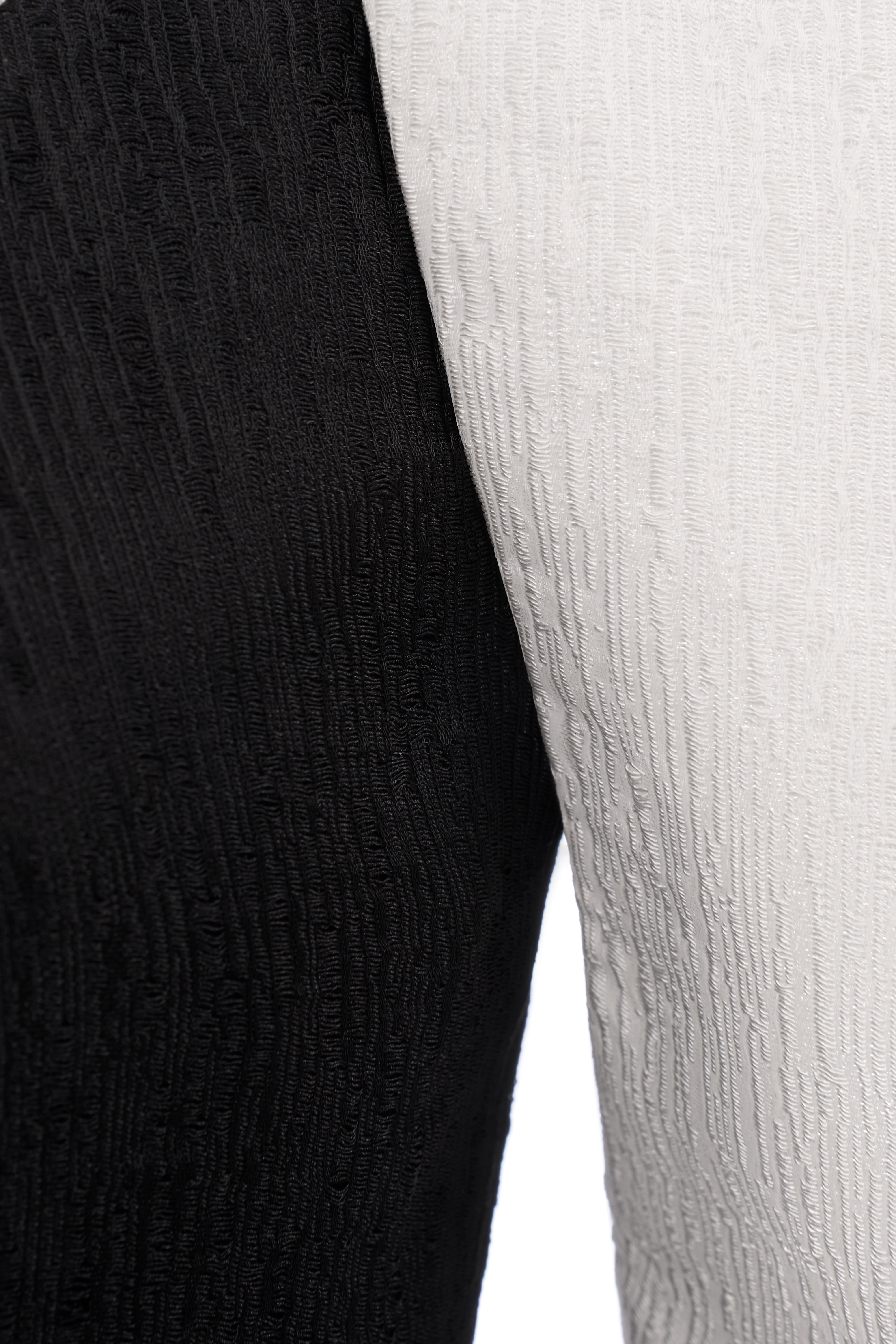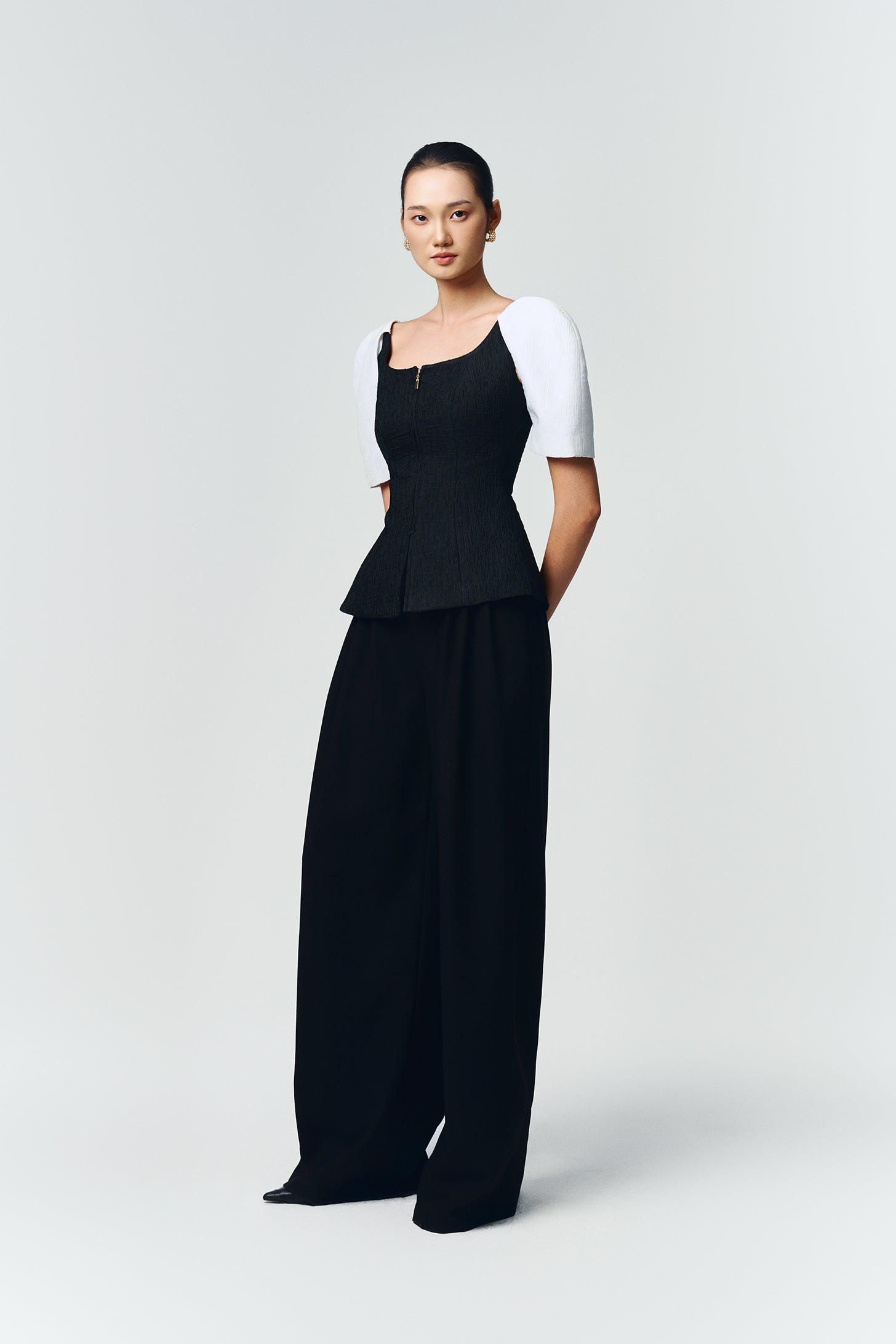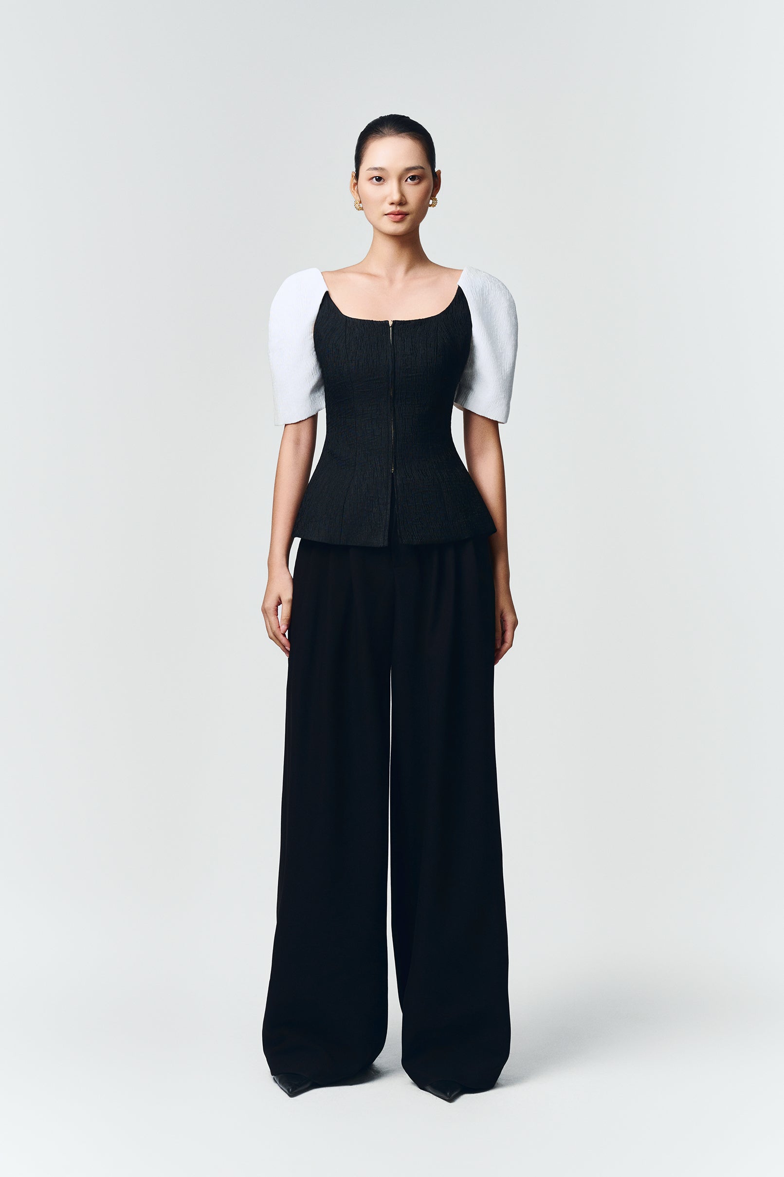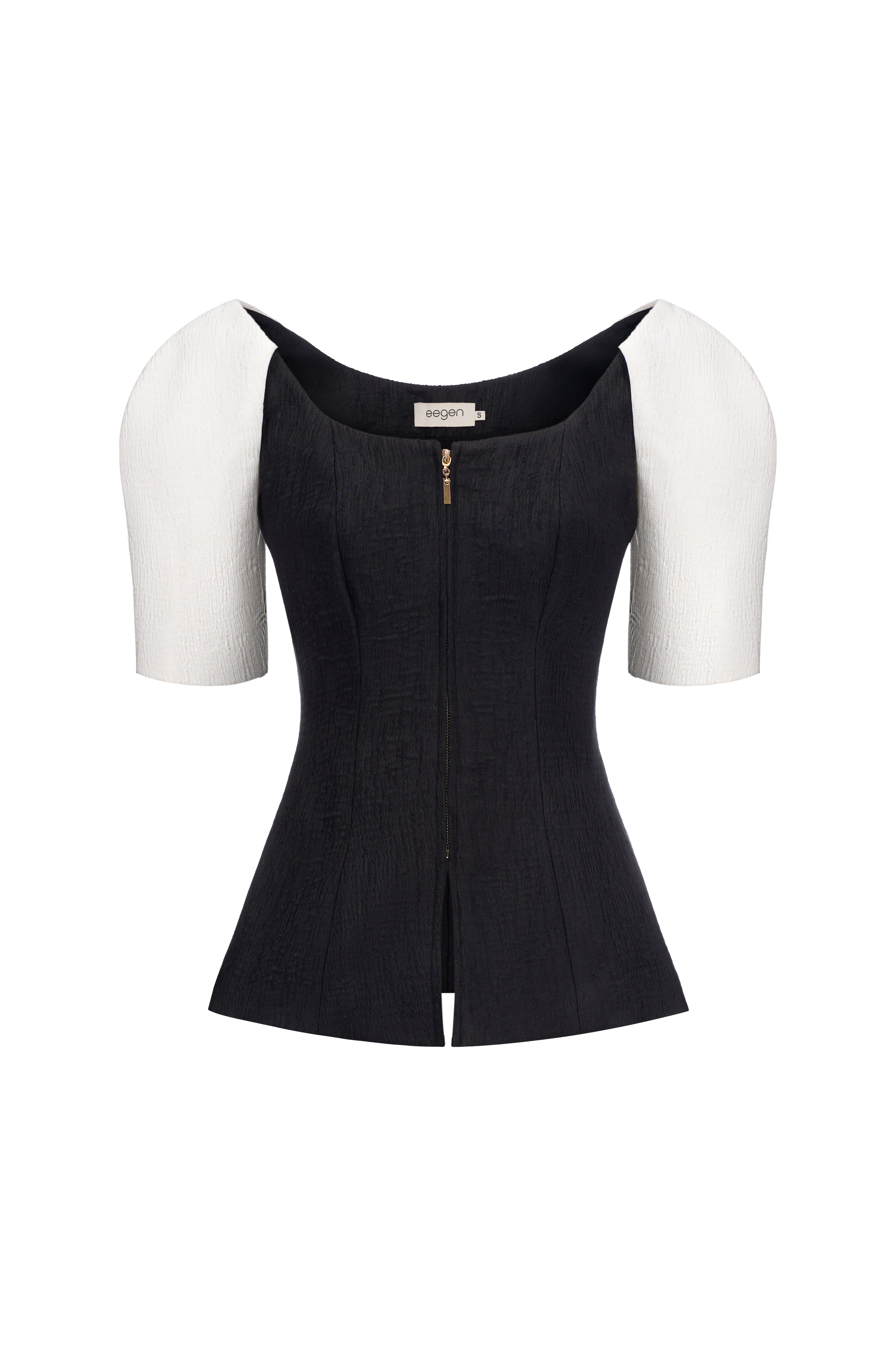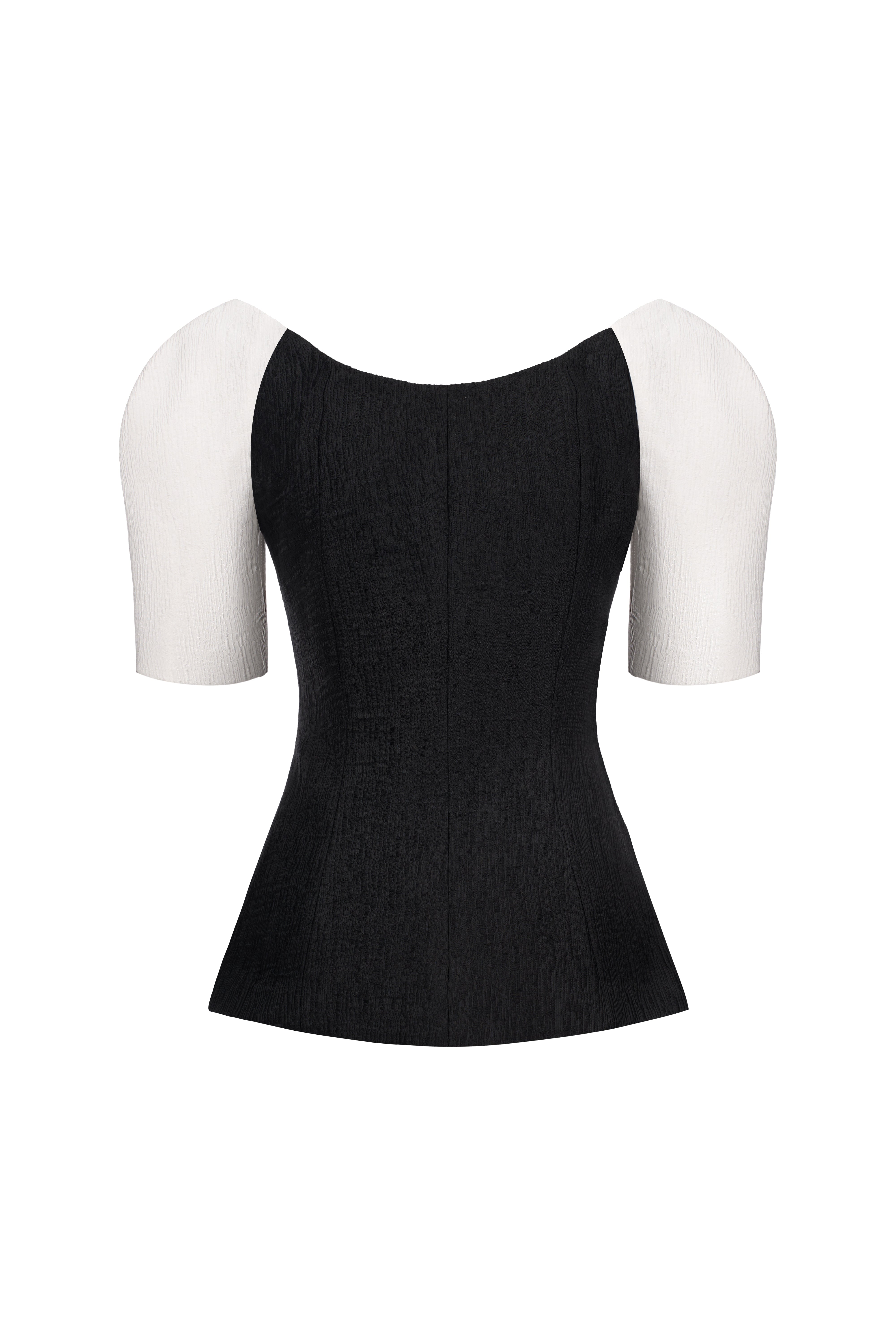 Long sleeve soft organza blouse with mesh lace lining. Large twisted pleat at front chest, draped square neckline.