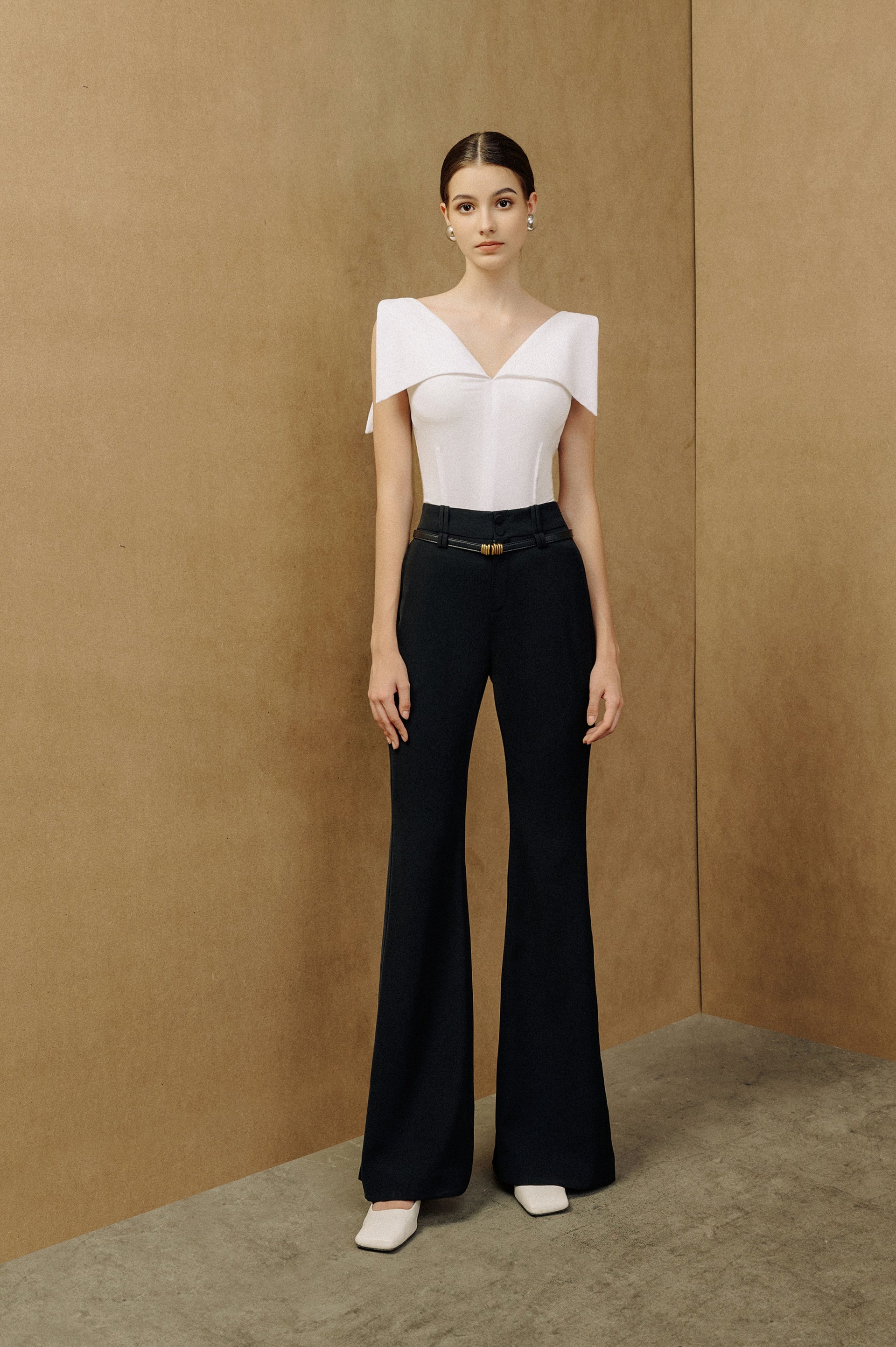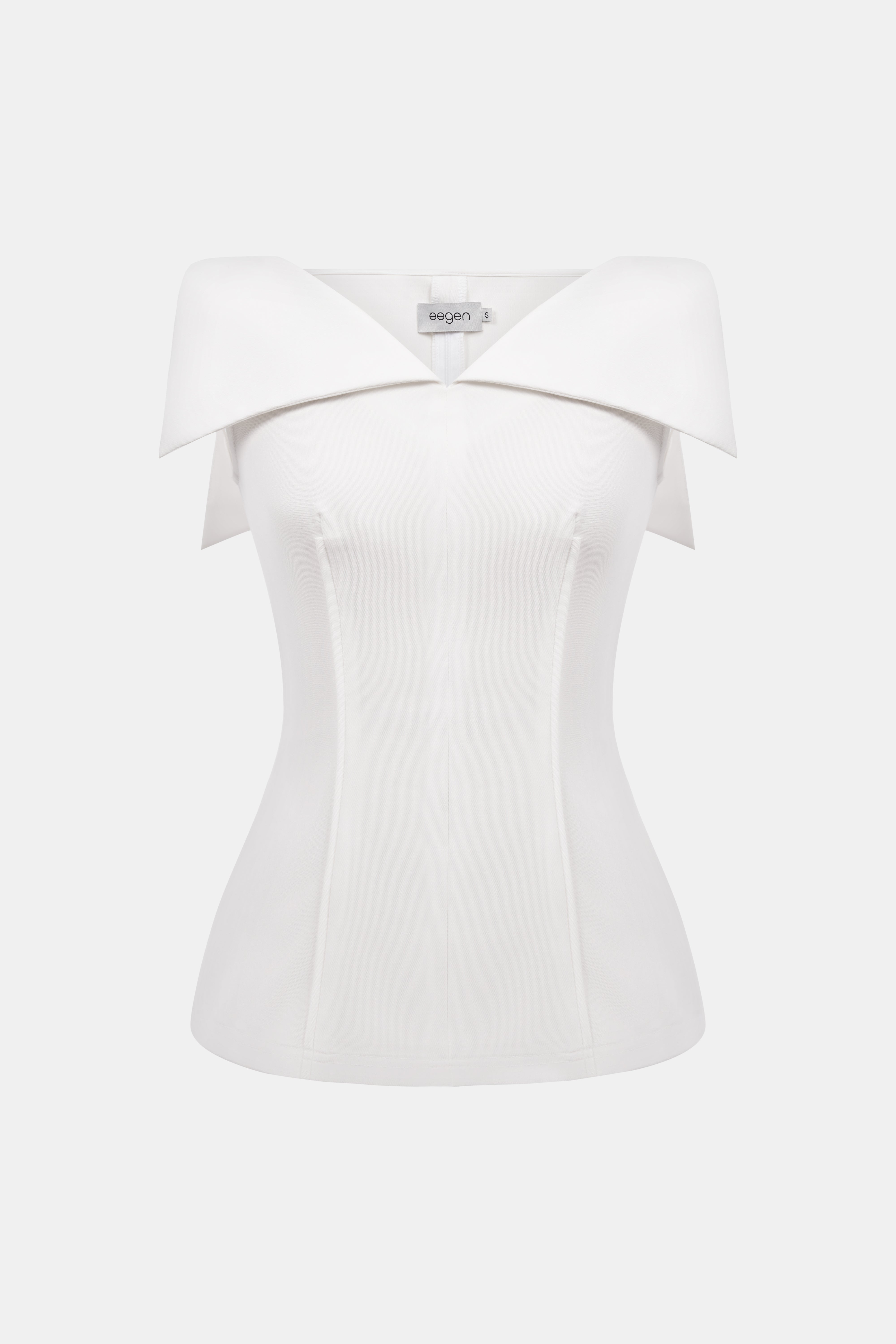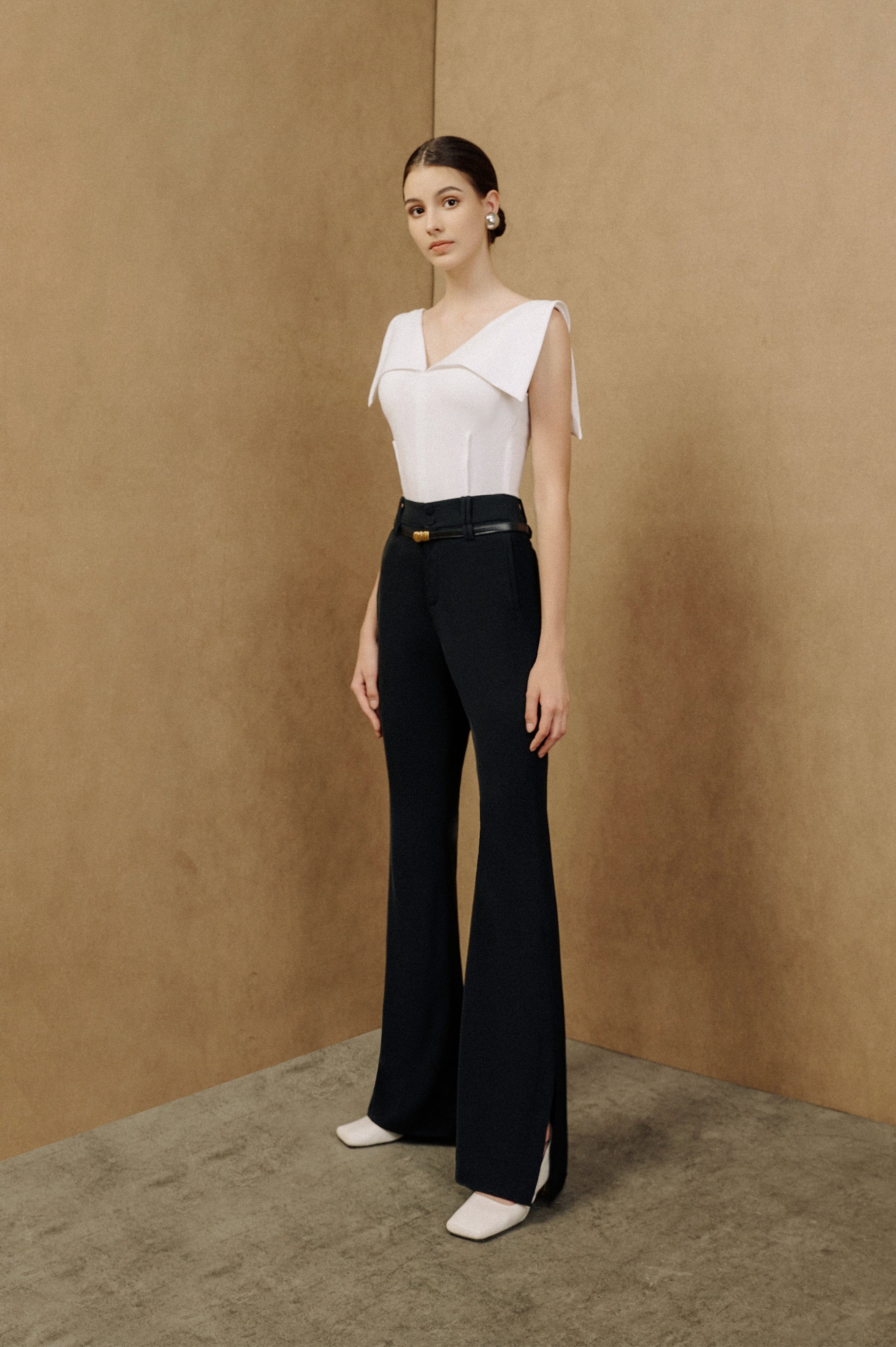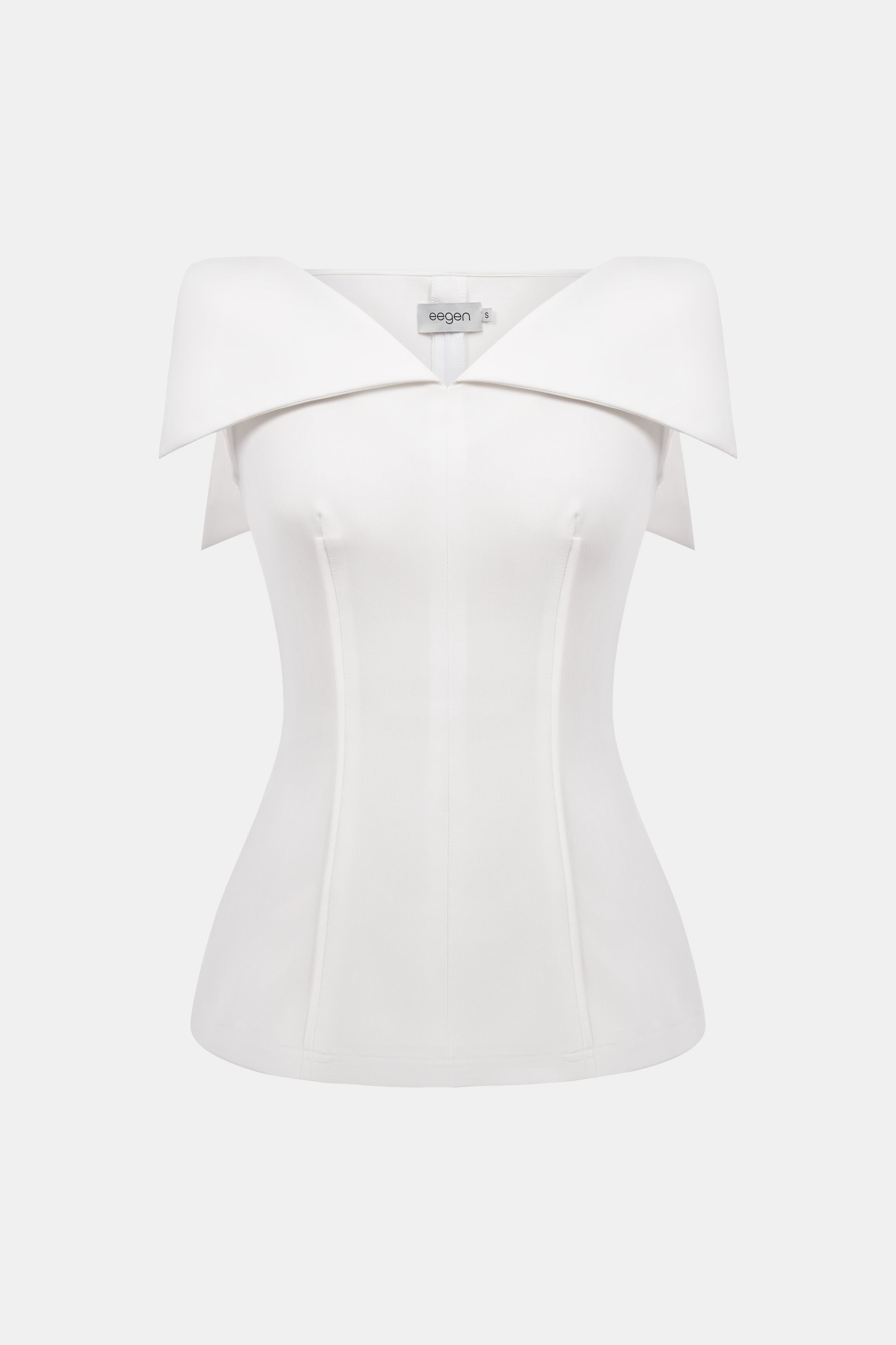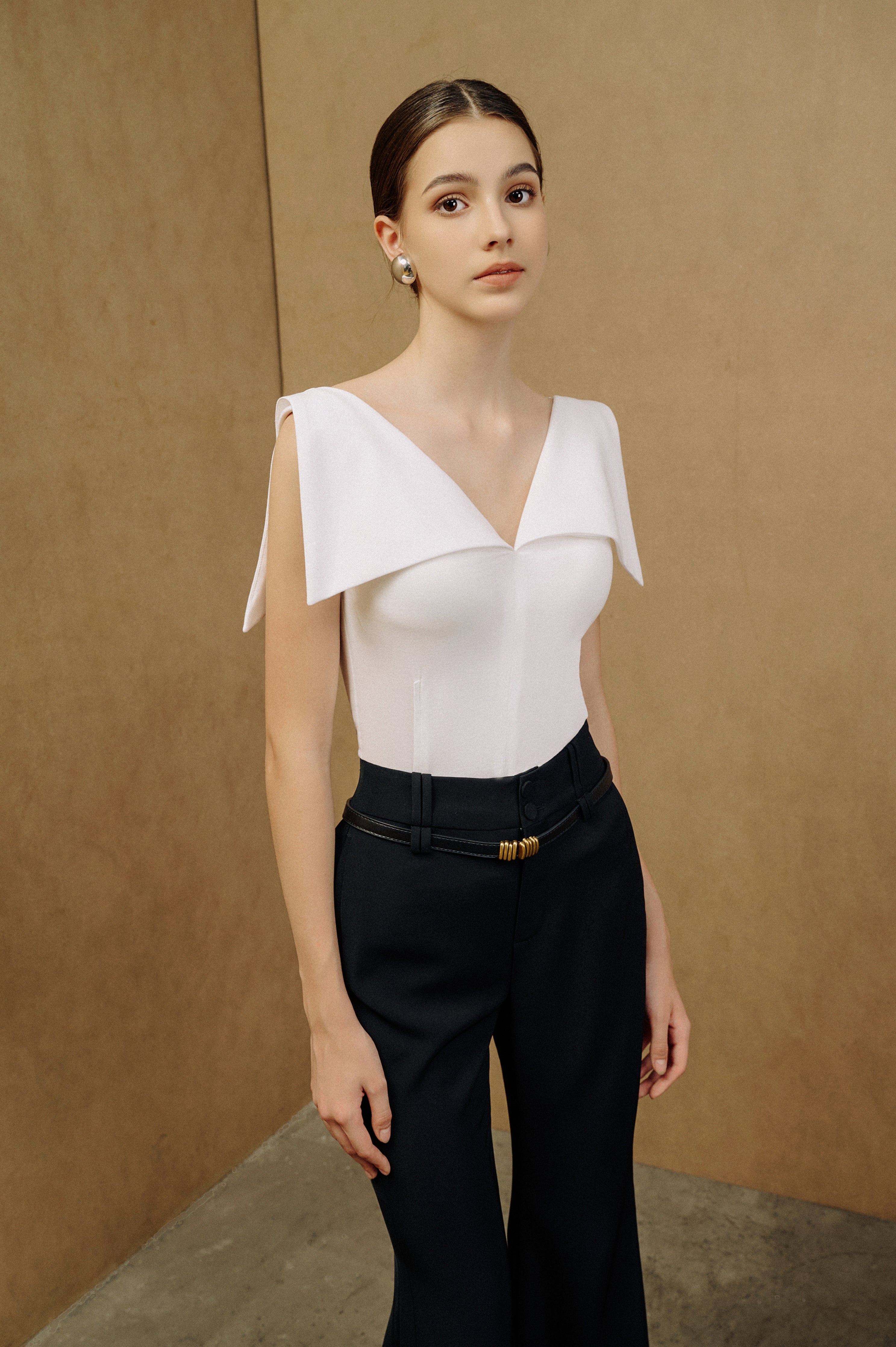 Revamp your wardrobe with our sleeveless V-neck top, tailored for a flattering fit. Highlighted by a large sailor-style collar and a pleat at the neckline, it's a stylish and versatile addition to your collection.