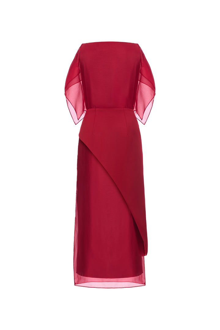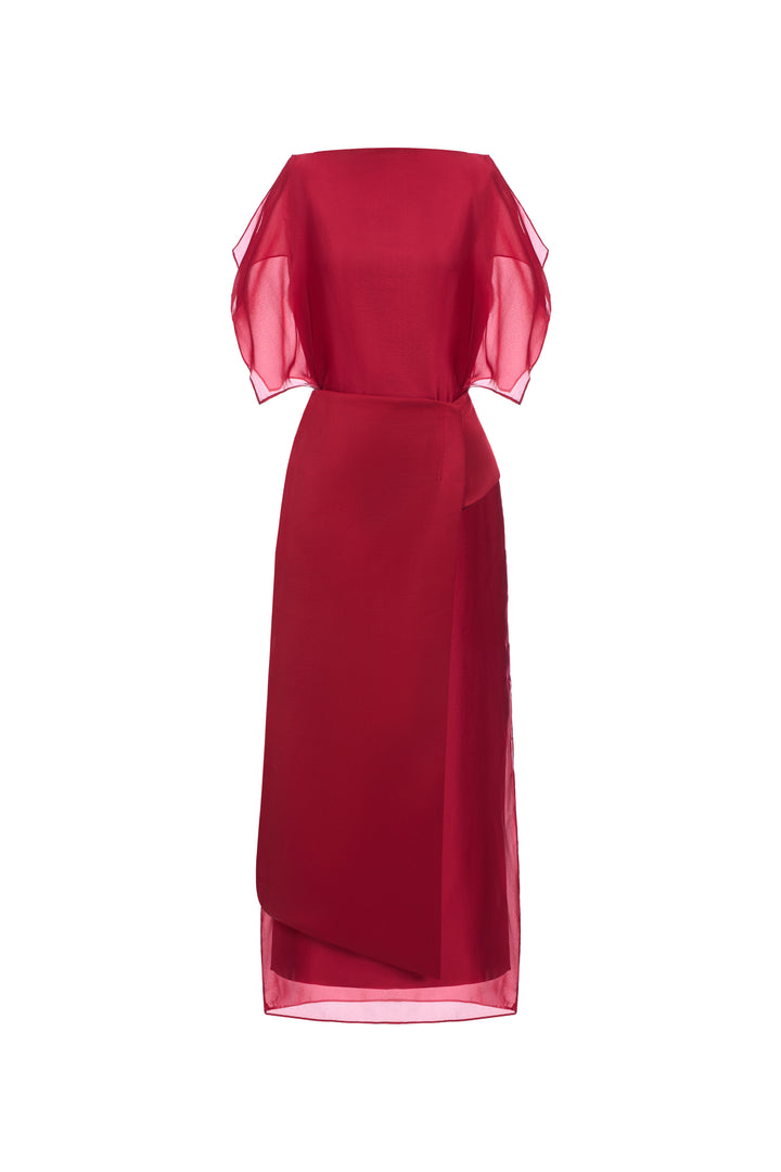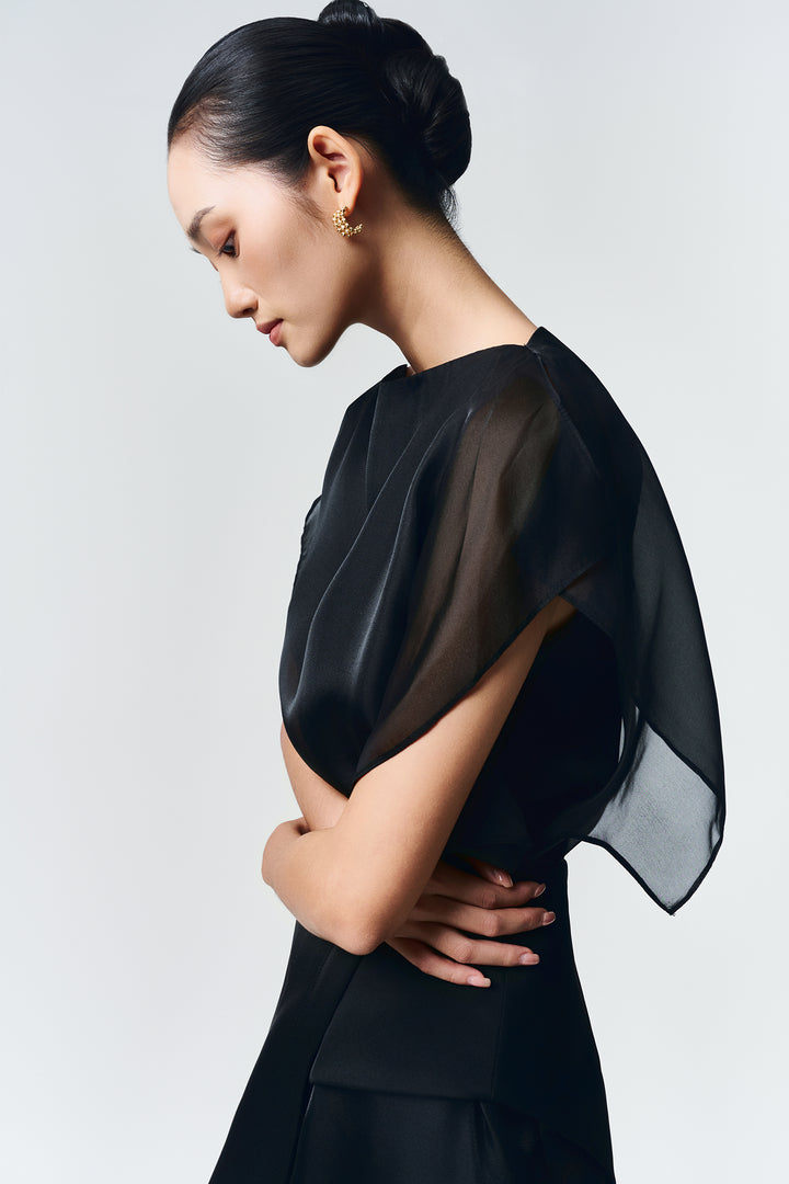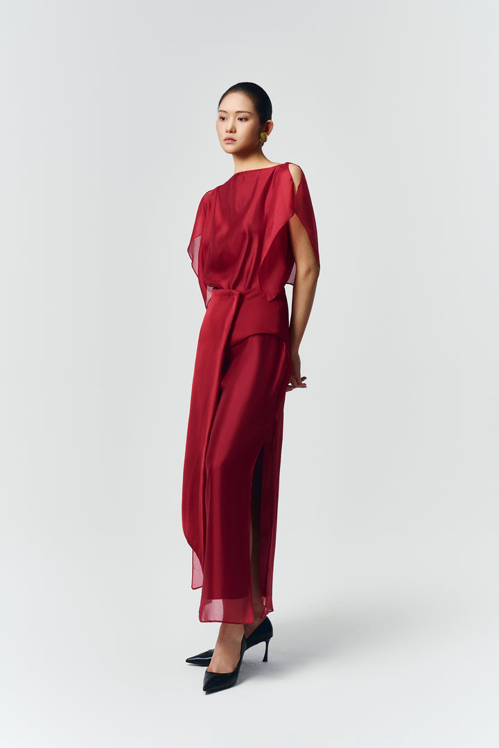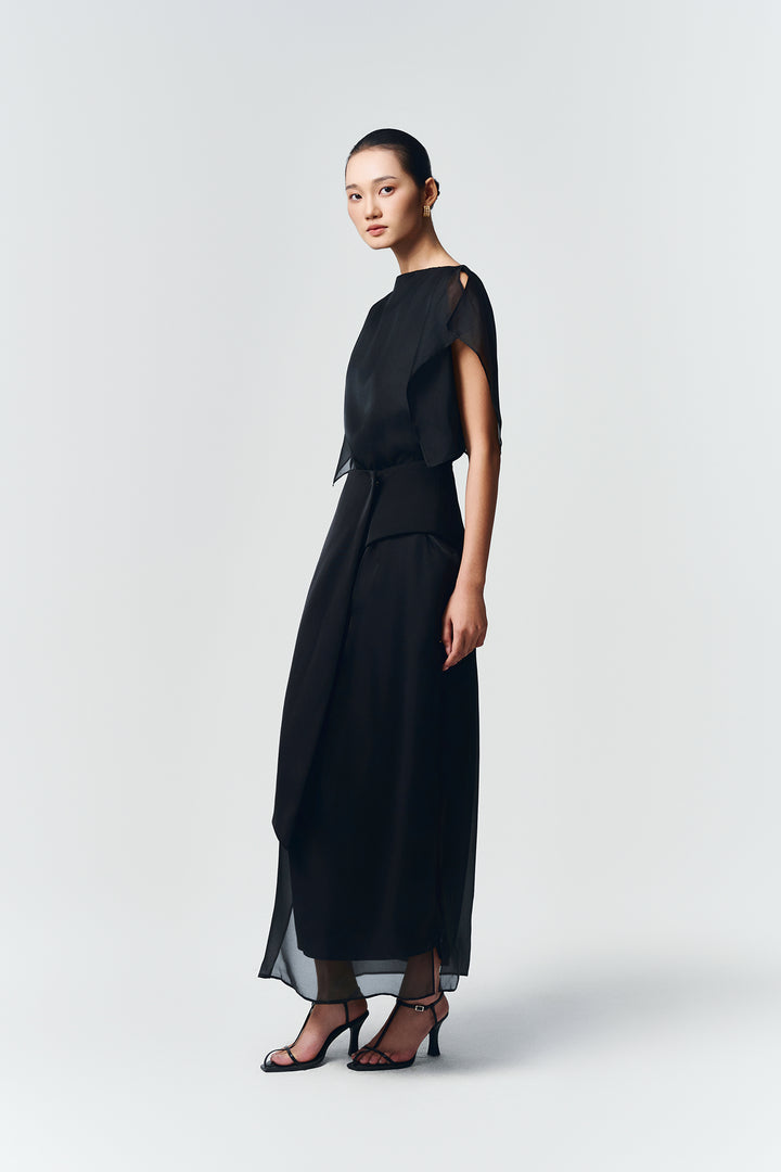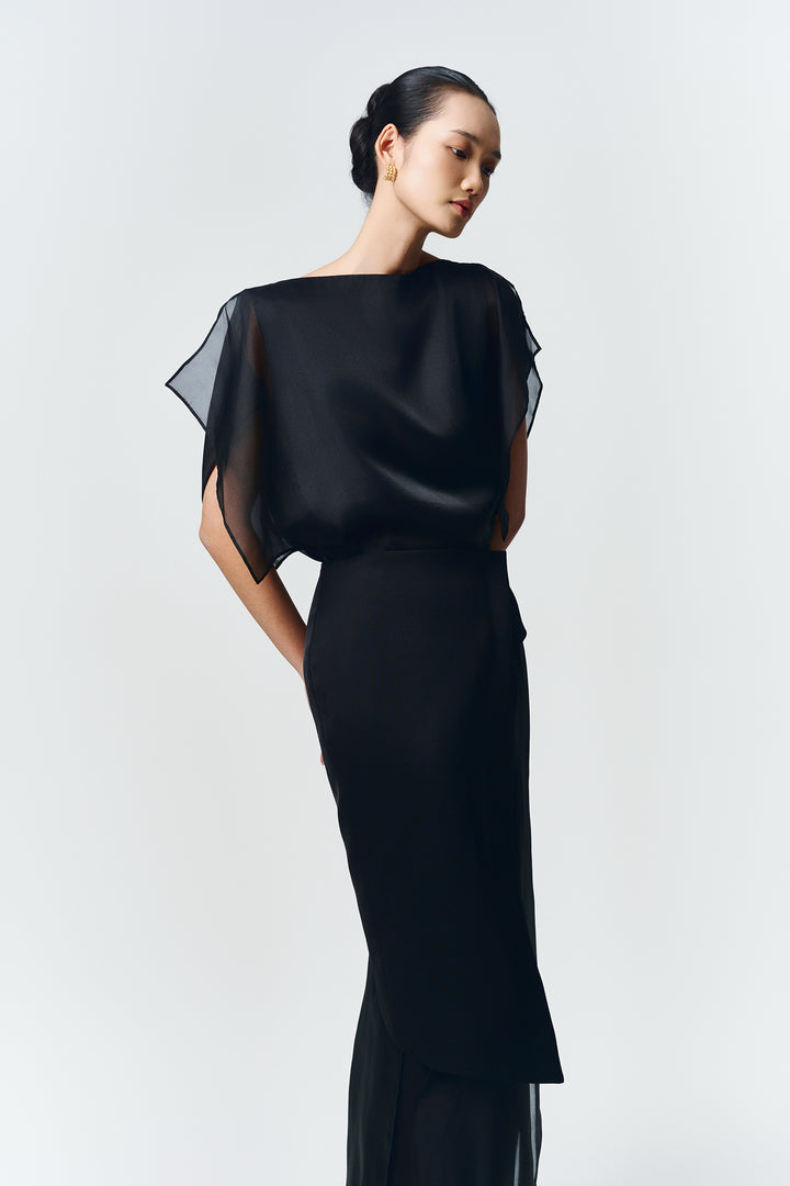 Soft organza straight dress with side slits. Fully lined with premium silk. Comes with an asymmetrical detachable light-shiny taffeta panel.