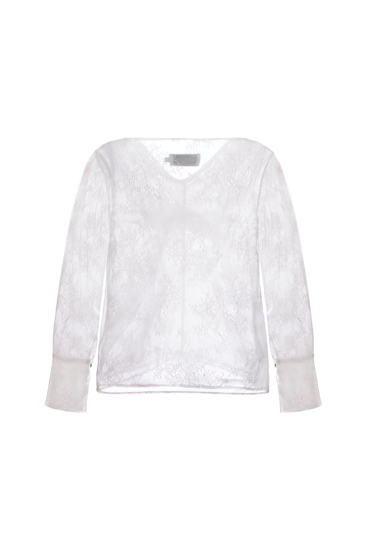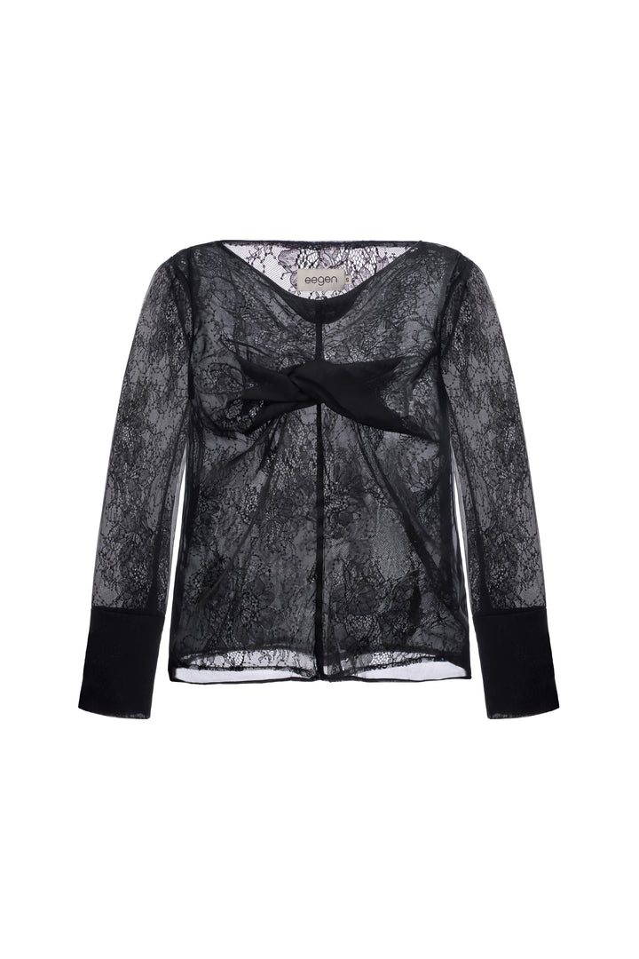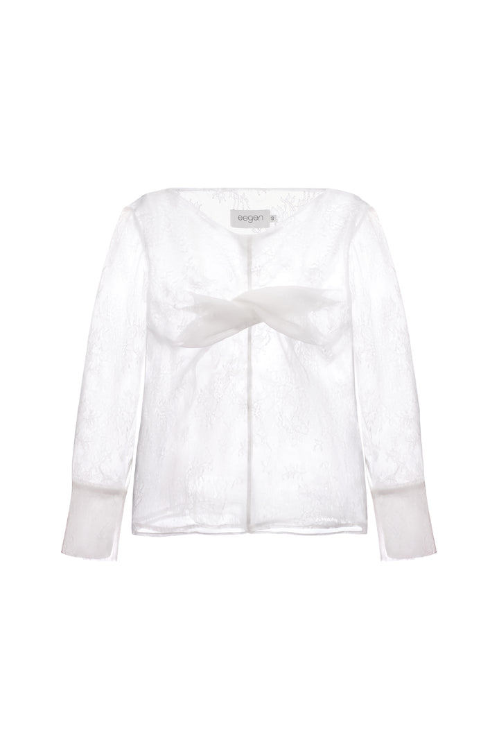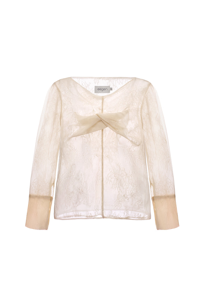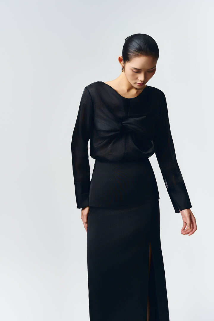Long sleeve soft organza blouse with mesh lace lining. Large twisted pleat at front chest, draped square neckline.