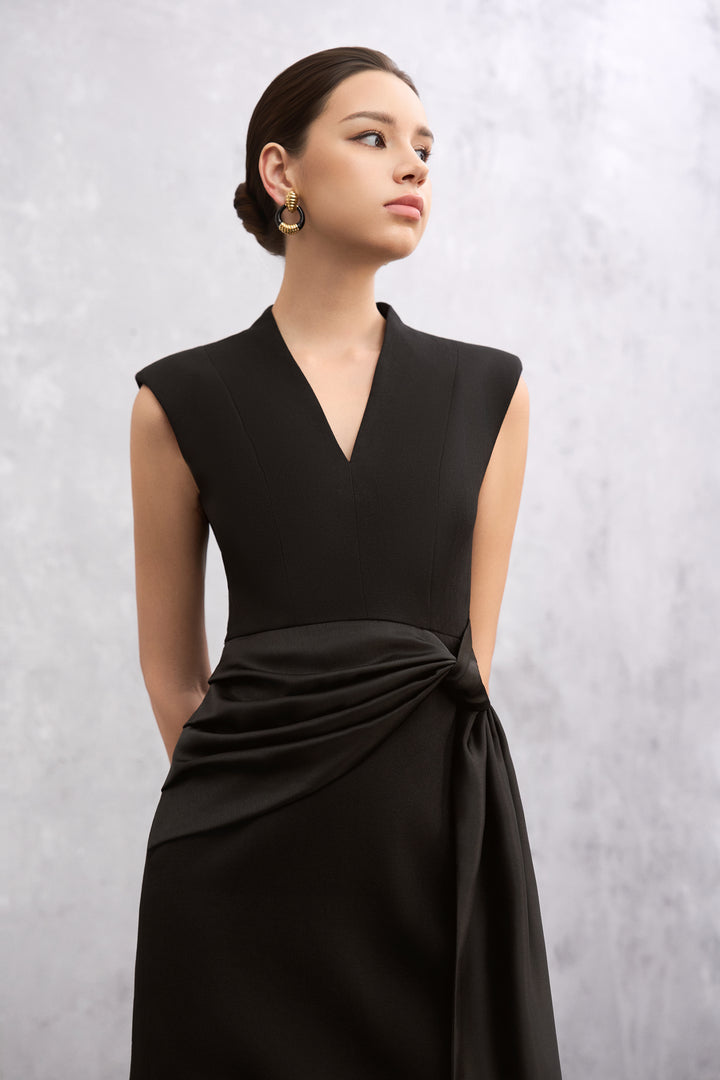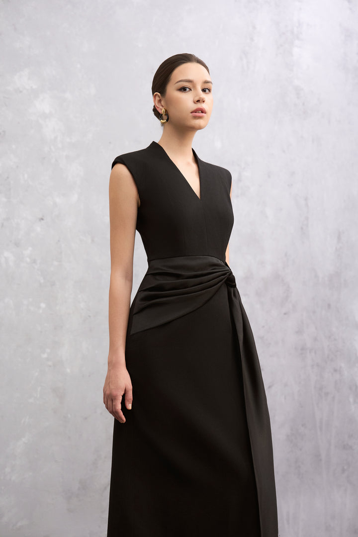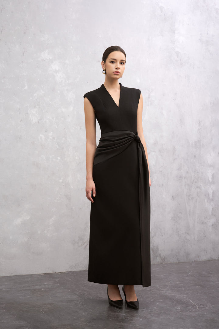 The Serenith Dress embodies quiet grace and thoughtful design. A gentle V-neckline lifts the gaze, while softly structured shoulders and delicate draping at the waist create a silhouette that flows with ease. Subtle folds gather at the hip, catching the light with every movement. Full-length and poised, it’s a piece that speaks in gentle tones — refined, effortless, and undeniably elegant.