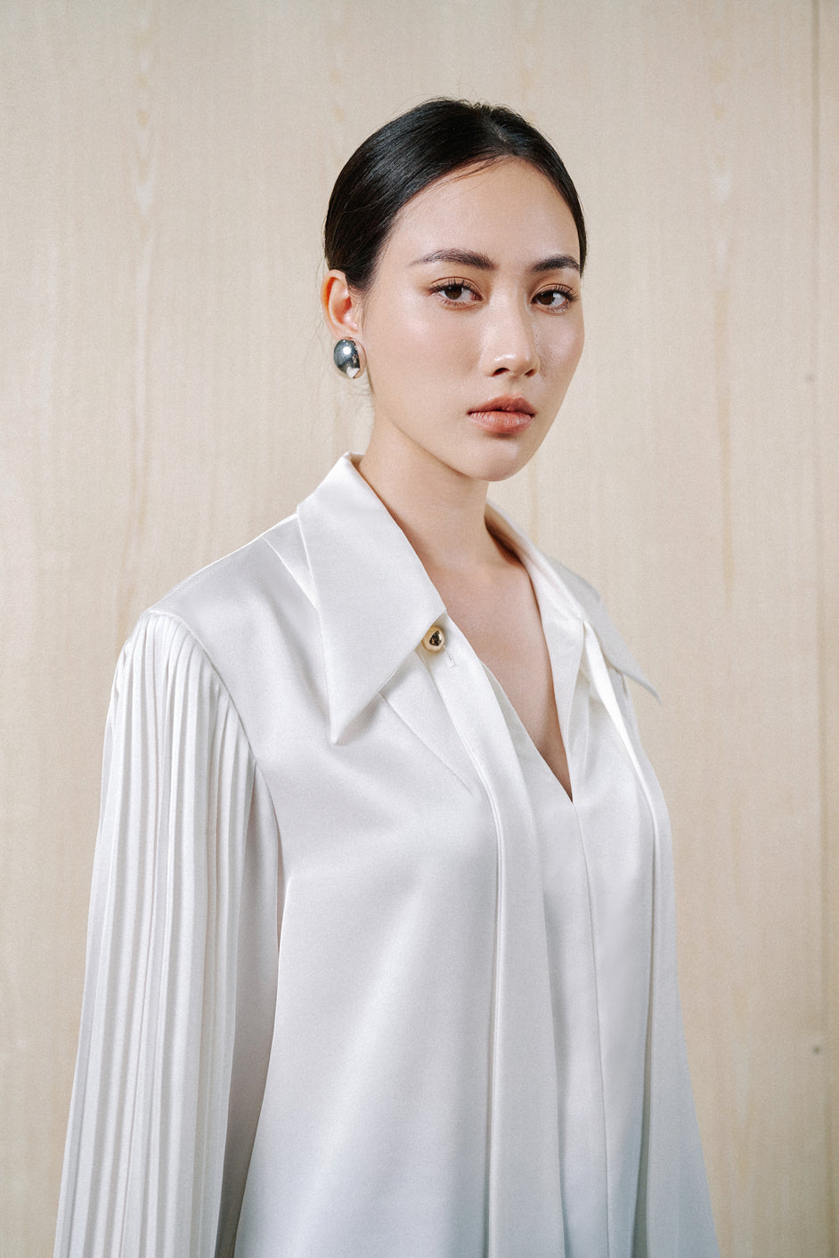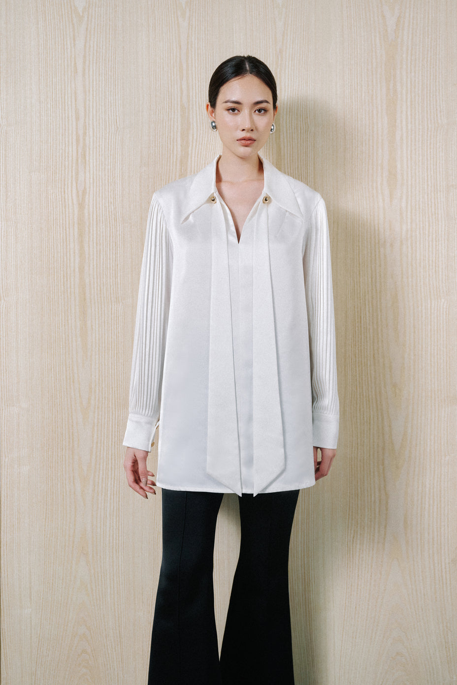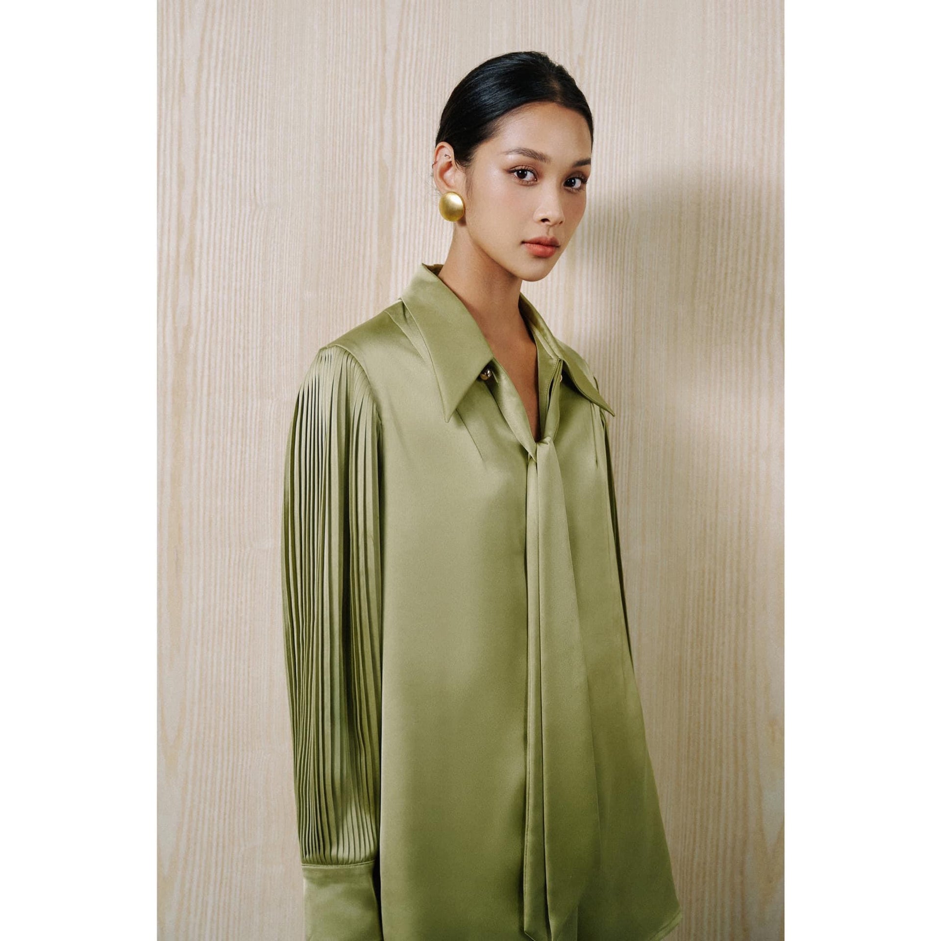 The Jersey Silk shirt features a simple, classic German collar with two elegant gold metal buttons at the base of the neck. The long sleeves have stamped cuffs in the middle of the sleeve. The shirt comes with detachable straps that can be tied in a bow around the neck or as a belt around the waist for versatile styling options Β  Note:*The product is ready to ship, shipping time varies from 5-15 days.**The product can be customized based on the measurement of 3 circumferences (bust, waist, hip) with an additional cost of 10-25%, and the customization time takes 1-3...
