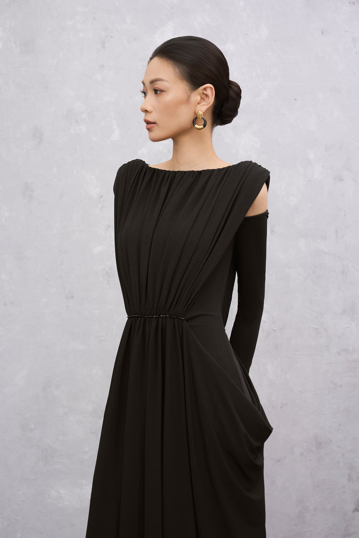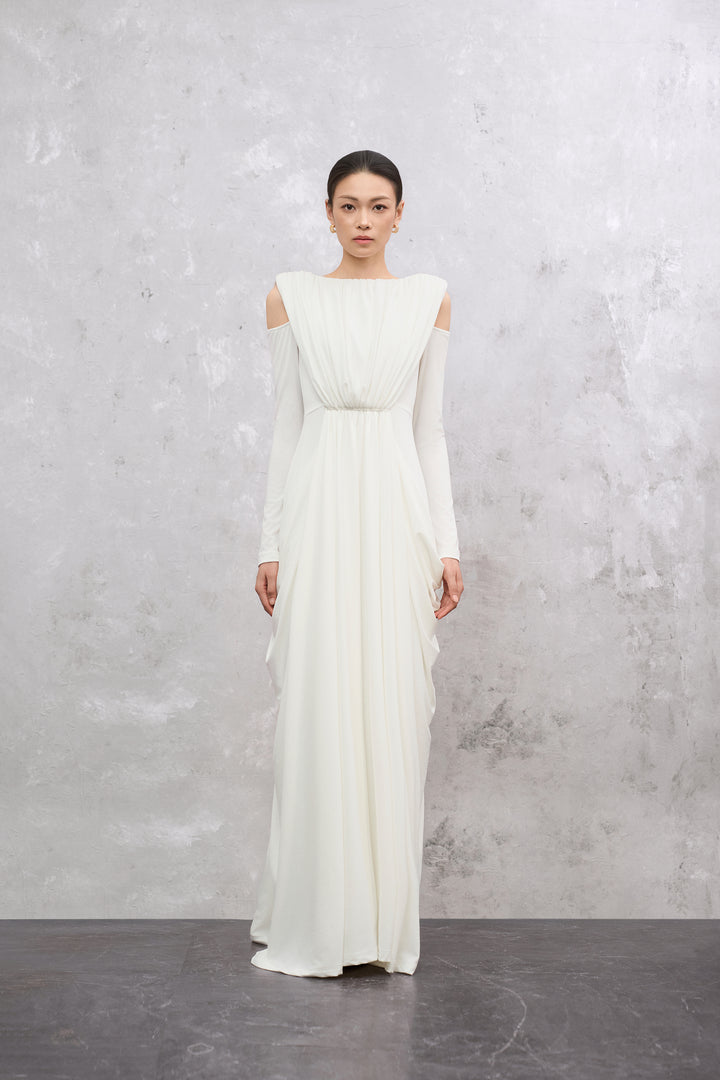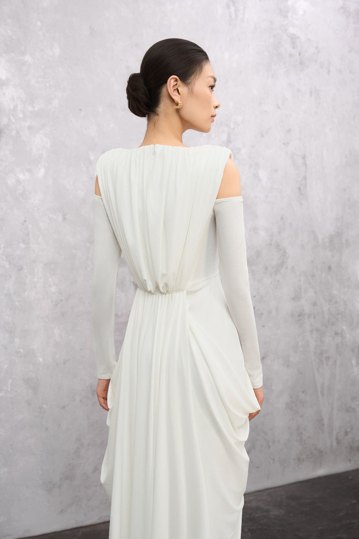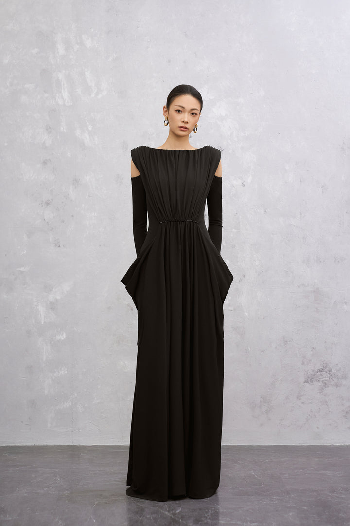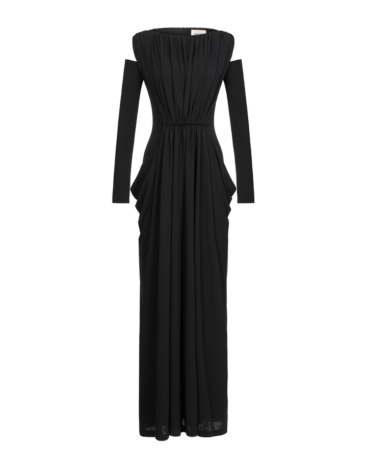 Sculptural draping and soft cut-outs frame the shoulders in quiet strength, while a gathered waist defines the silhouette with ease. Deep folds flow through a long, fluid column, creating natural movement with every step. Designed for presence and poise, the Vela Dress embodies timeless elegance in every moment.