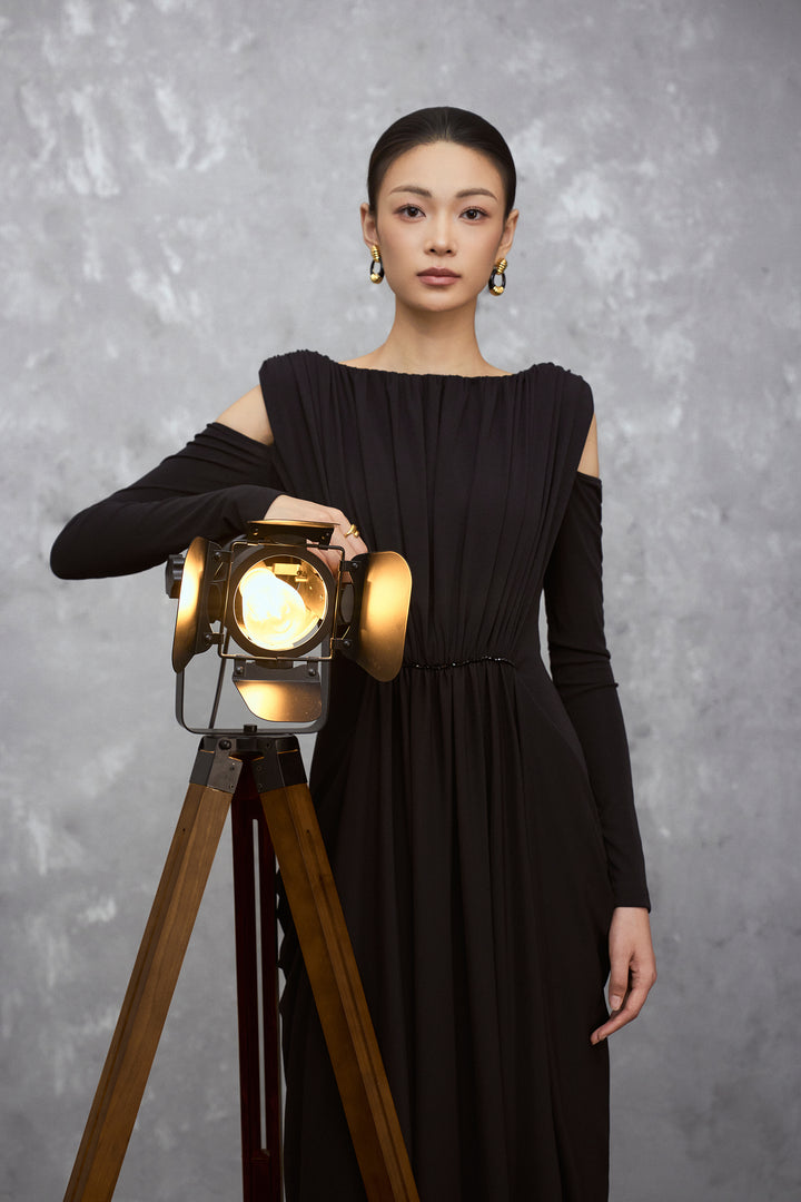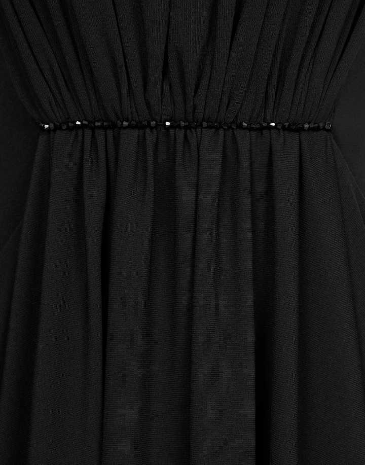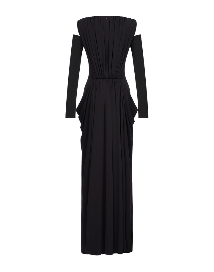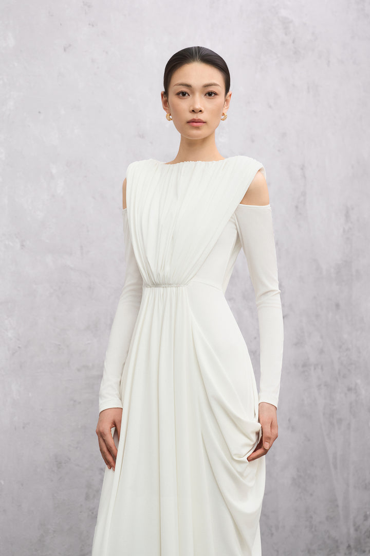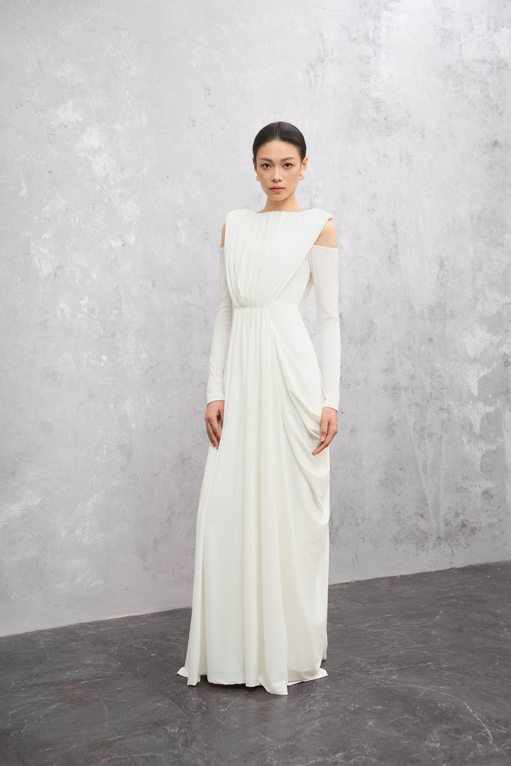 Sculptural draping and soft cut-outs frame the shoulders in quiet strength, while a gathered waist defines the silhouette with ease. Deep folds flow through a long, fluid column, creating natural movement with every step. Designed for presence and poise, the Vela Dress embodies timeless elegance in every moment.